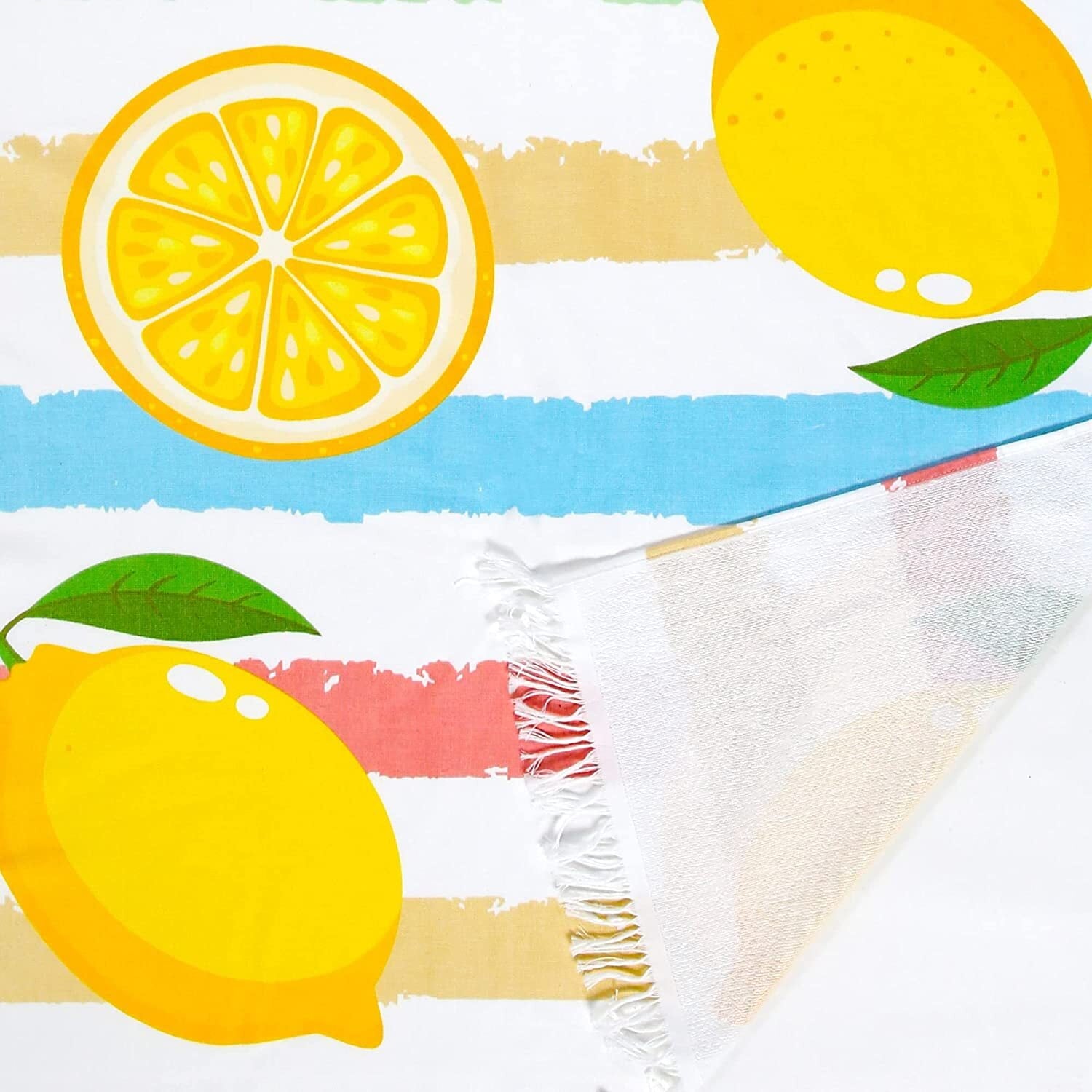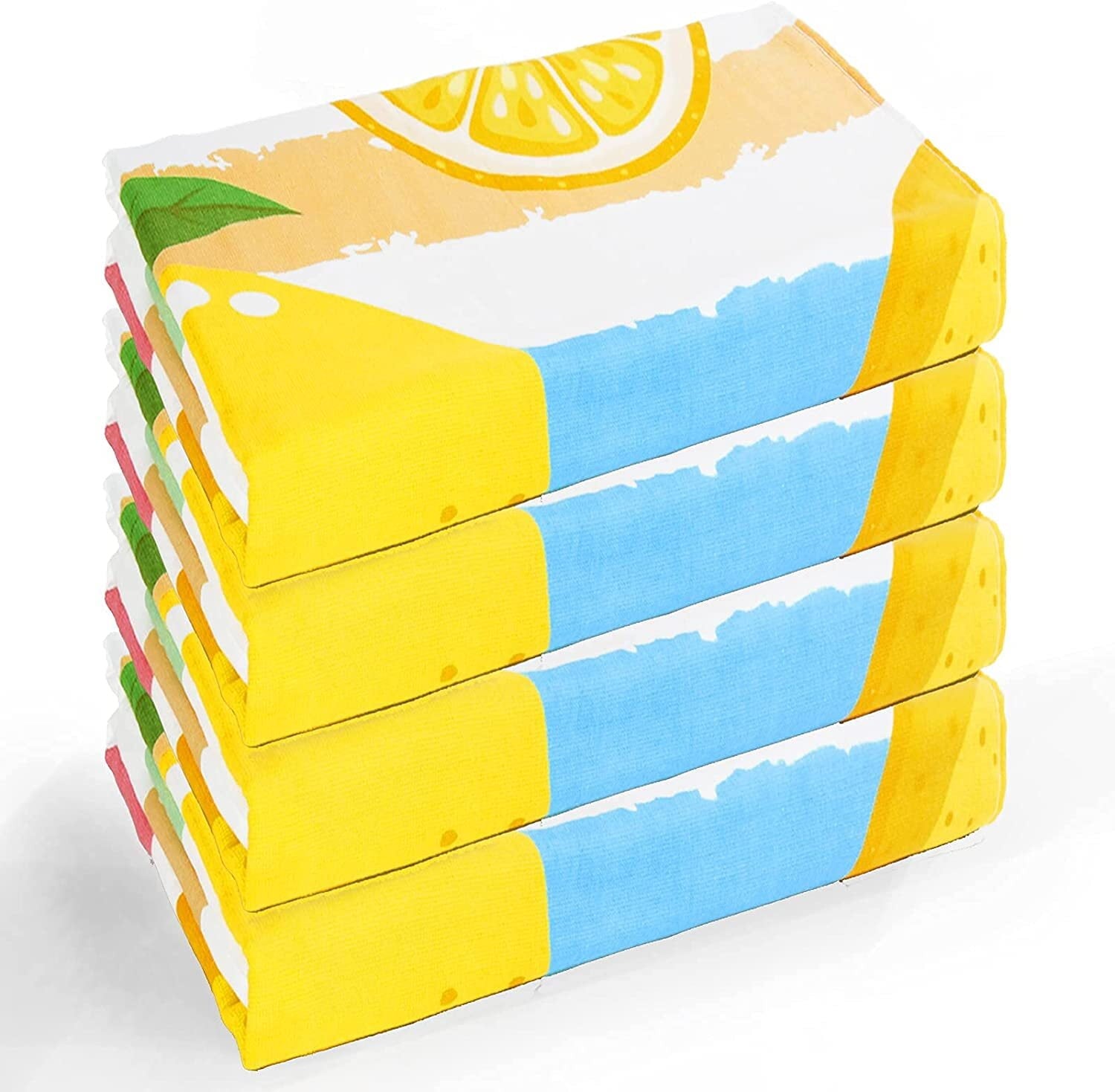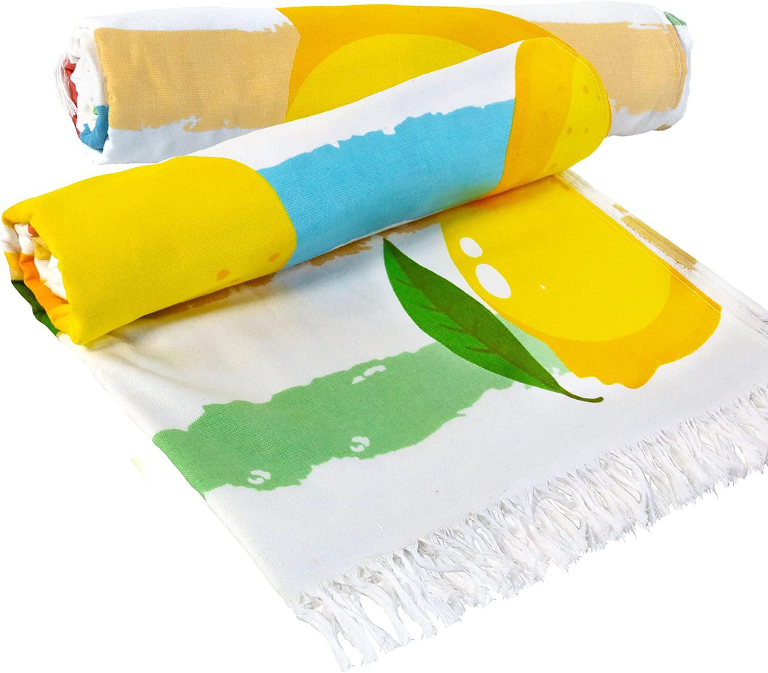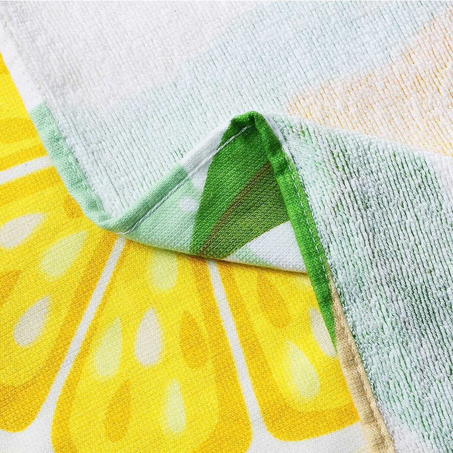 Quality: Made of 100% cotton, our beach towel is super soft and absorbent. The several washes of our durable towel will make it softer without shrinkage and wrinkles.Set: This beach towel set includes 4 pieces of oversized lemon towel (35x70 Inch). It is very compact and lightweight, easy to pack and carry.Design: Printed with colorful cabana stripes and cute watermelon/lemon/pineapple/avocado pattern, this beach towel is pleasing to the eye, a perfect and chic travel companion.Absorbent and sandfree: This beach pool towel soaks up water easily, and provides moisture-wicking control to keep your skin cool and dry. The tight weave technology makes sands and dusts difficult to adhere to.Care Instruction: Machine Wash Cold, Tumble Dry on Low, please wash it separately for the first time, and wash similar color of towel together, No Bleaching, No ironing.