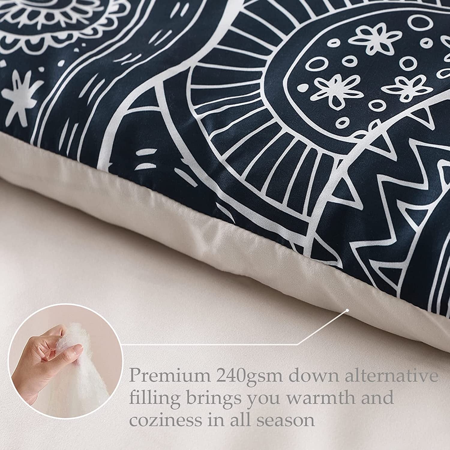 Whale Flotilla comforter set features its warm and soft touch, Wear-resistant and washable fabric, as well as delicate printing patterns. It boasts various styles of patterns including vintage patchwork, countryside floral, farmhouse botanical leaf and bohemian paisley. There are two sizes available to choose: queen comforter set and king size bedding comforter set. It is not only a bed comforter but also a bed cover, coverlet and bedspread.SOFT & WARM: Stuffed with ultra soft silk-like polyester filling and enclosed with brushed breathable microfiber shell, this comforter features cloud-like softness and coziness. When you crawl on the bed after day work, this soft comforter would warmly wrap your tired body, soothe your nervous feelings and lead you into a sweet dream.REVERSIBLE & ELEGANT: The reversible and beautiful design makes the bedding comforter set stand out from normal plain other products. The front side of comforters are digitally printed with various attractive patterns, from vintage patchwork to exotic paisley and countryside floral style. Just pick a favorable design, to spruce up your bedroom, guestroom or living room.LIGHTWEIGHT & Wear-resistant: Compared with other heavy duvet without air circulation, our comforters are lightweight and breathable, perfect for year-round use. Thanks to its Wear-resistant material, digital printing technology and hidden stitch design, it is machine washable and holds up well in the wash. No shedding, No bunching, No color fading.DIMENSIONS: Queen comforter set includes 1 comforter (90”x90”) and 2 pillow shams (20”x26”). King size bed comforter set includes 1 comforter (90”x104”) and 2 pillow shams (20”x36”). Please take the height of your mattress into consideration before purchase to choose a right size.CARE INSTRUCTION: Wash it on a delicate setting with cold water and a mild detergent. Tumble dry low. Tips: our comforter sets take compact vacuum package to save space and protect environment. Please wash it before the first use, hang it dry and pat it gently, then you will get a more fluffy and comfy duvet.