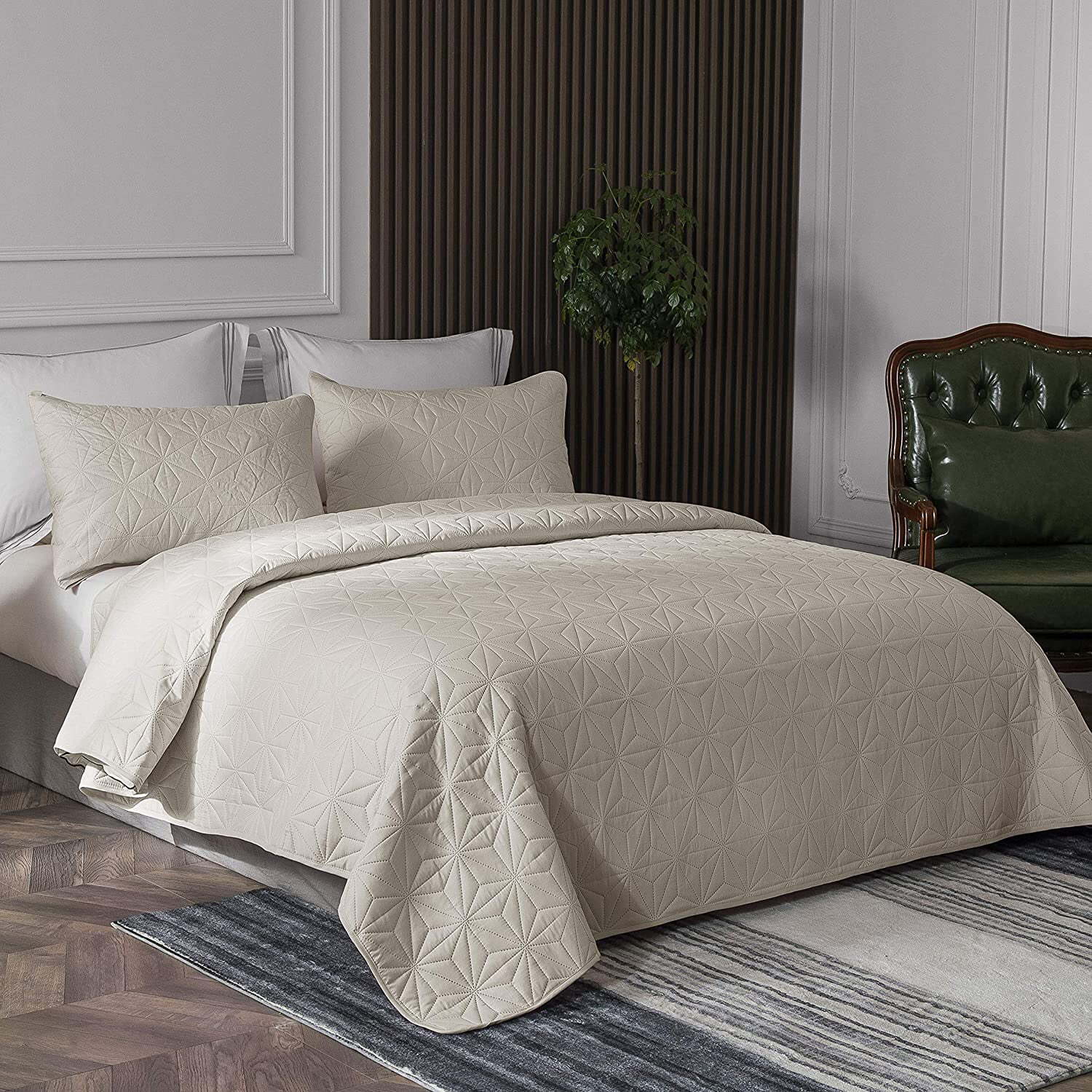 Whale Flotilla Microfiber King Size (96x104 inches) Quilt Set Lightweight Quilted Bedspreads Coverlets Set with Stars Pattern, Brich Beige, 3 Piece (1 Quilt, 2 Shams)