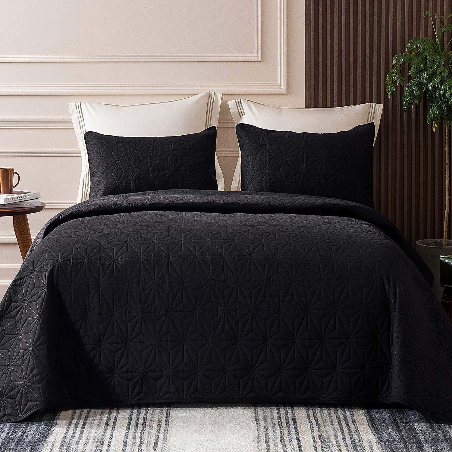 Whale Flotilla Microfiber Queen Size (96x90 inches) Quilt Set Lightweight Quilted Bedspreads Coverlets Set with Stars Pattern, Black , 3 Piece (1 Quilt, 2 Shams)