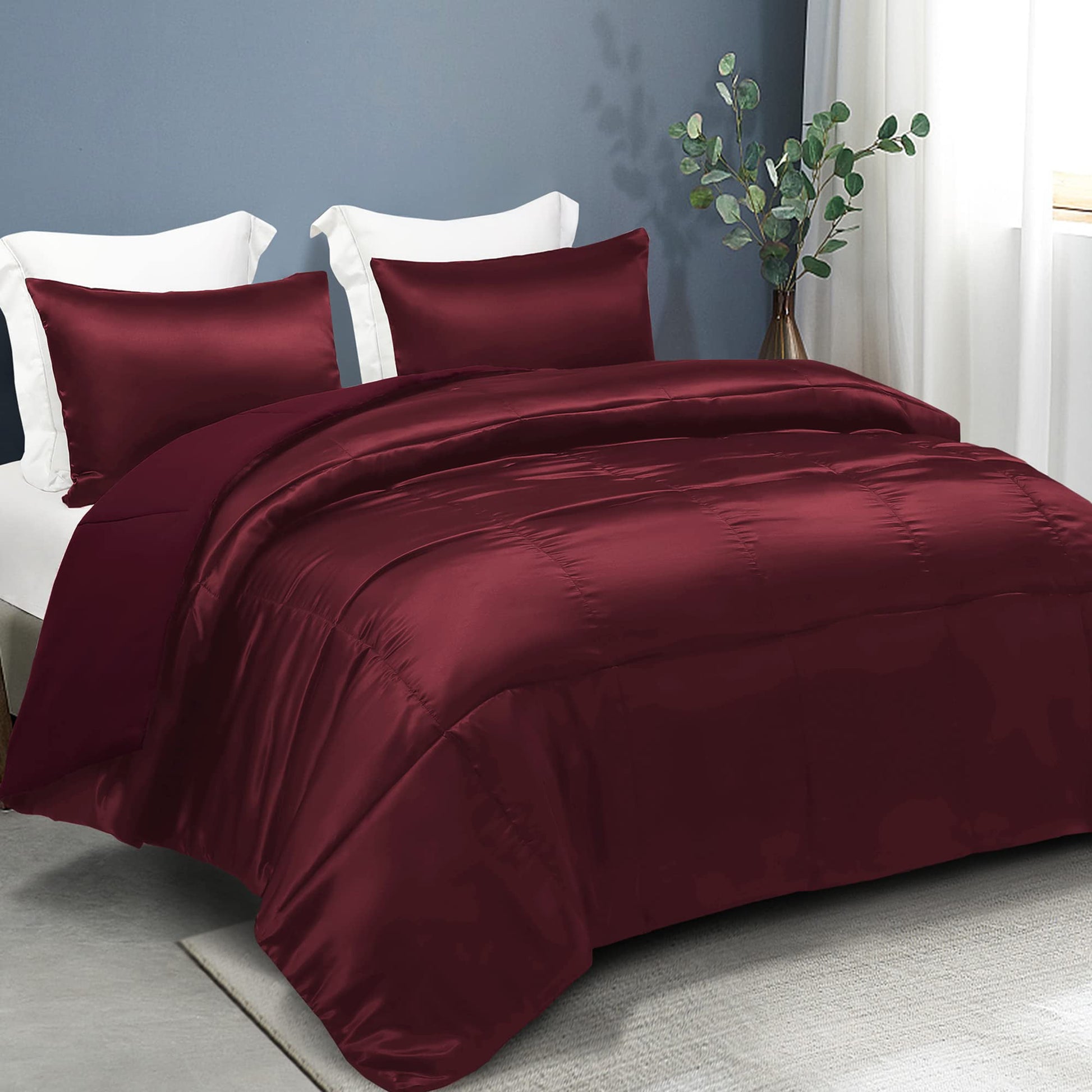 Package include - The queen comforter set includes one comforter (88"X88"), and two standard satin pillowcases (20"x26"). There is always one you would like or goes well with comforter. Soft and Breathable - Satin duvet set is smooth, soft, breathable and sensitive skin-friendly. The silk-like fabric full of the extraordinary texture, which is ultra soft against your skin. This comfy and breathable satin duvet will make you refreshed when you wake up. Unique Design: This ultra comfortable bedding set is double-side design. One side of the duvet is pure satin fabric with an elegant style box stitching that prevent the fill from shifting, reflecting charming pearly lustre in the light. The other side is made of brushed fabric, which makes the duvet more breathable and durable than cotton fabric. You could choose either one side to cover as you like. MULTI-PURPOSE USAGE - This satin comforters is lightweight but could reach the high demand of feeling warm in winter and cool in summer so that it can be used all the year round. This comforter set can decorate your room perfectly and create a luxurious style. It is also a sweet gift for your families and friends, offering them an ample and relaxing sleeping with our super soft and lightweight comforters.Share