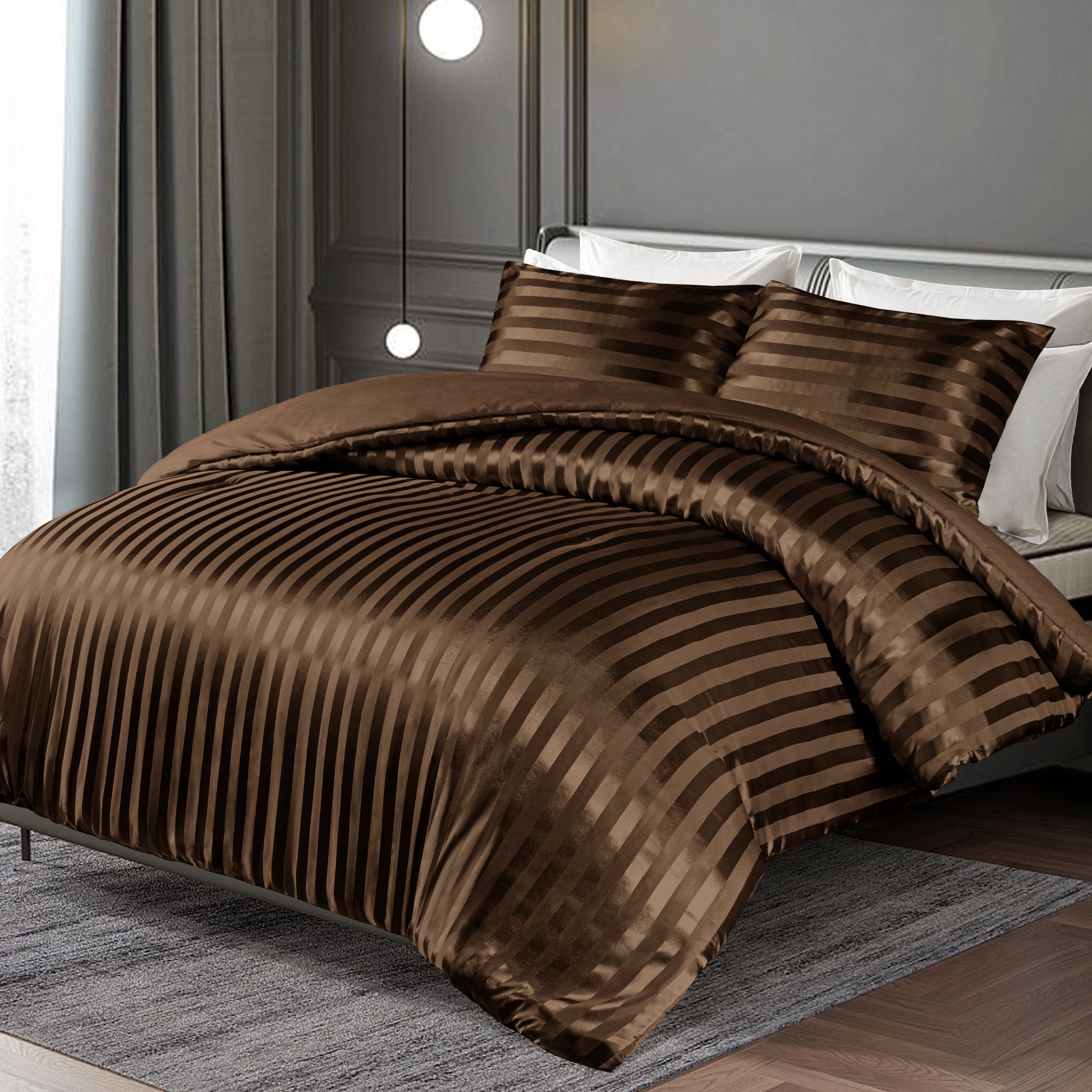 Whale Flotilla 3-Piece Reversible Silky Soft Queen Comforter Set, Luxury Stripe Satin Comforters Full Size Bedding Set with 2 Satin Pillowcases, Lightweight Duvet Set for All Seasons, Brown