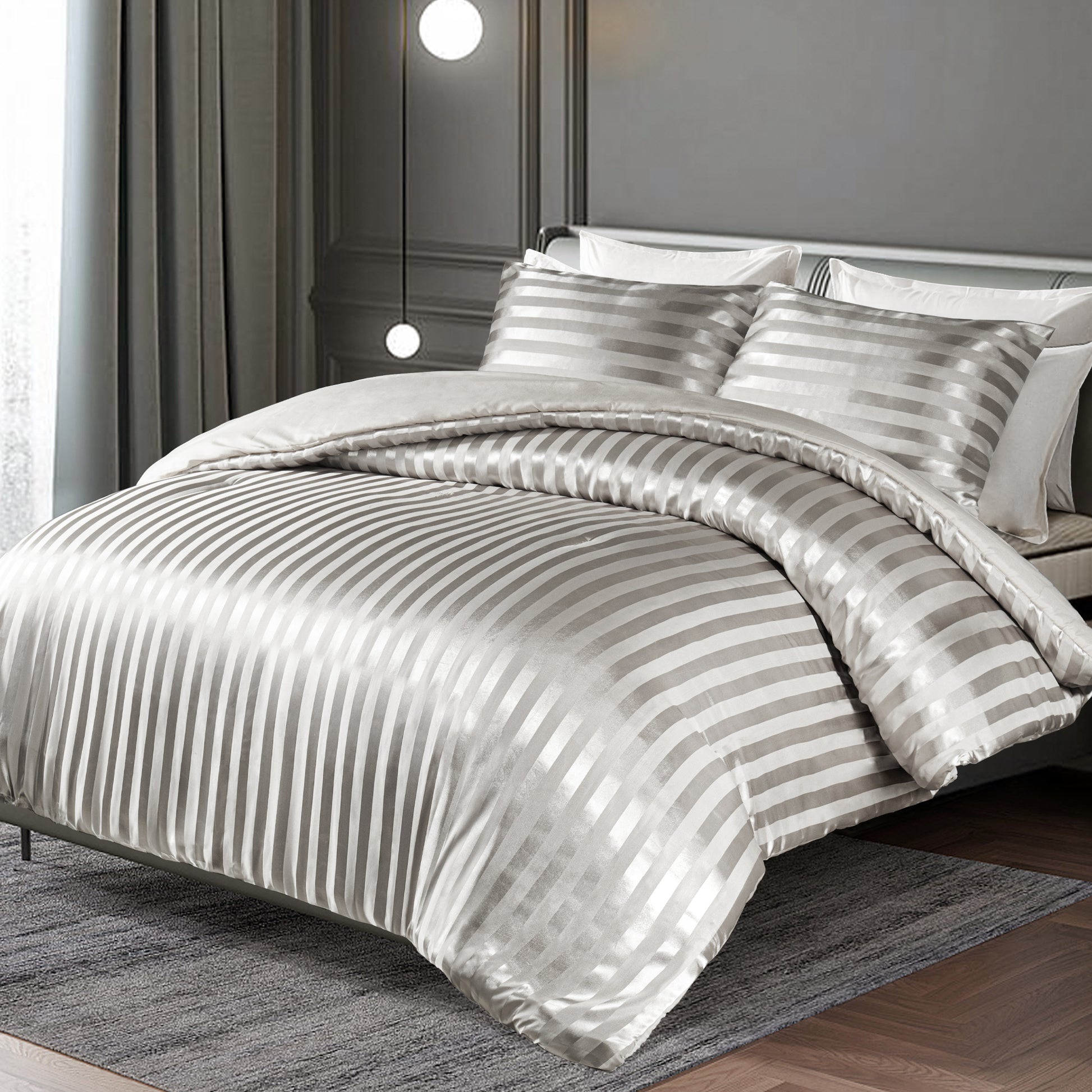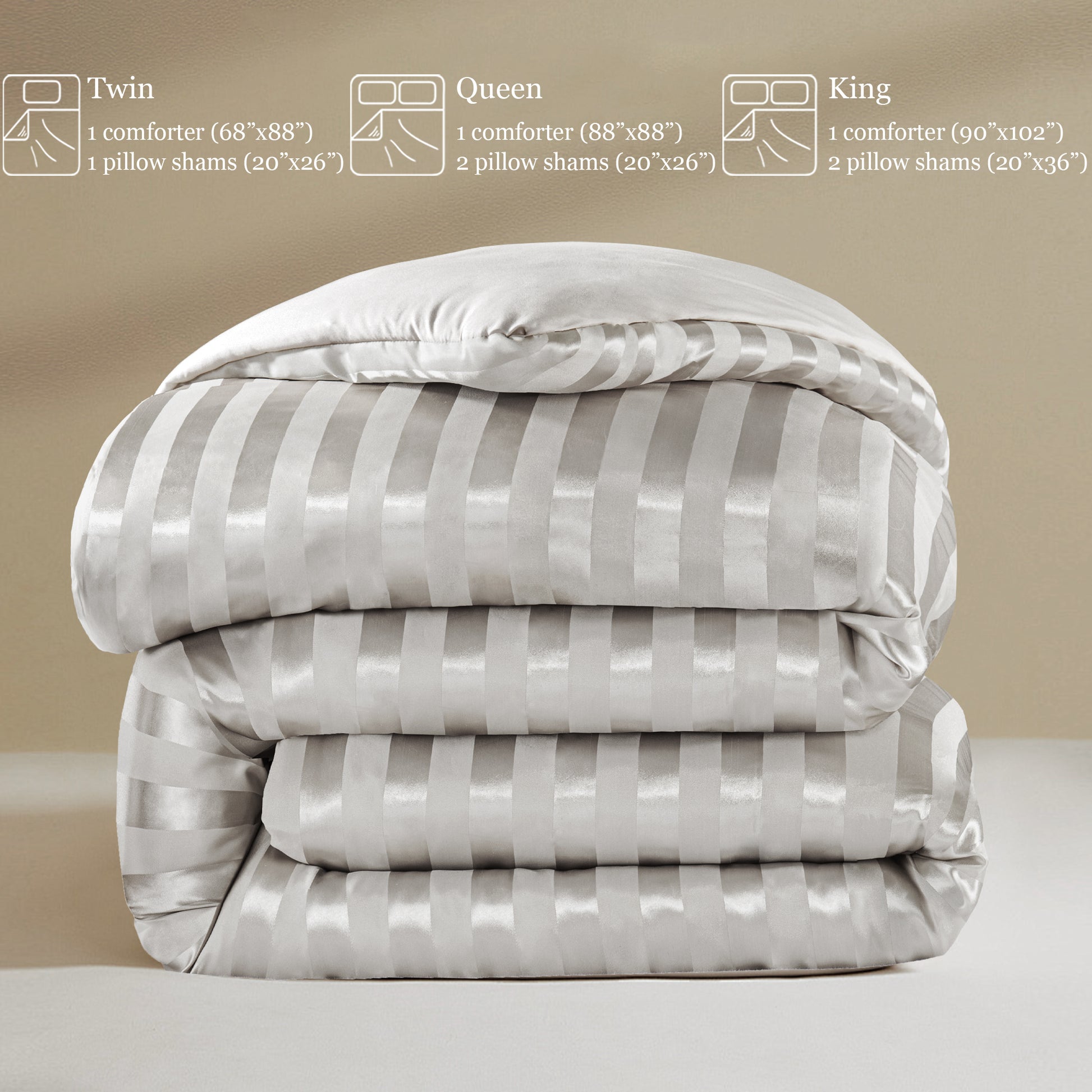 Whale Flotilla 3-Piece Reversible Silky Soft Queen Comforter Set, Luxury Stripe Satin Comforters Full Size Bedding Set with 2 Satin Pillowcases, Lightweight Duvet for All Seasons, Grey