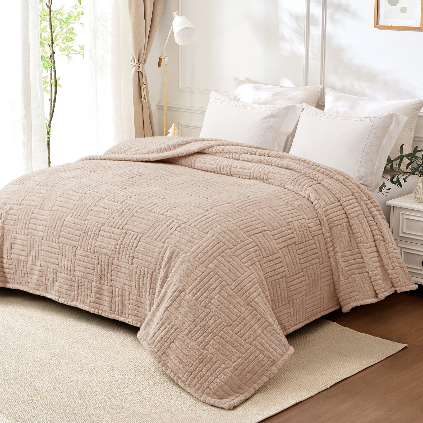 Whale Flotilla Fluffy Fleece Queen Size Blanket for Bed, Fuzzy Soft Cozy Exquisite Blankets with Decorative Jacquard Pattern for All Season, Warm but Lightweight, 90x90 Inch, Camel