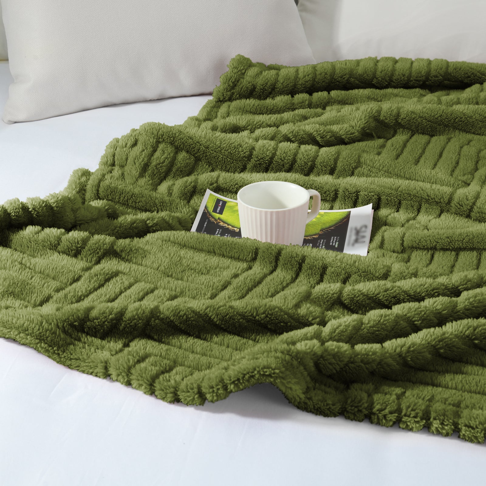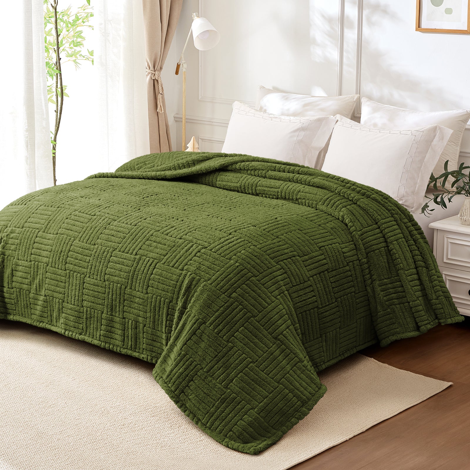Whale Flotilla Fluffy Fleece Queen Size Blanket for Bed, Fuzzy Soft Cozy Exquisite Blankets with Decorative Jacquard Pattern for All Season, Warm but Lightweight, 90x90 Inch, Olive
