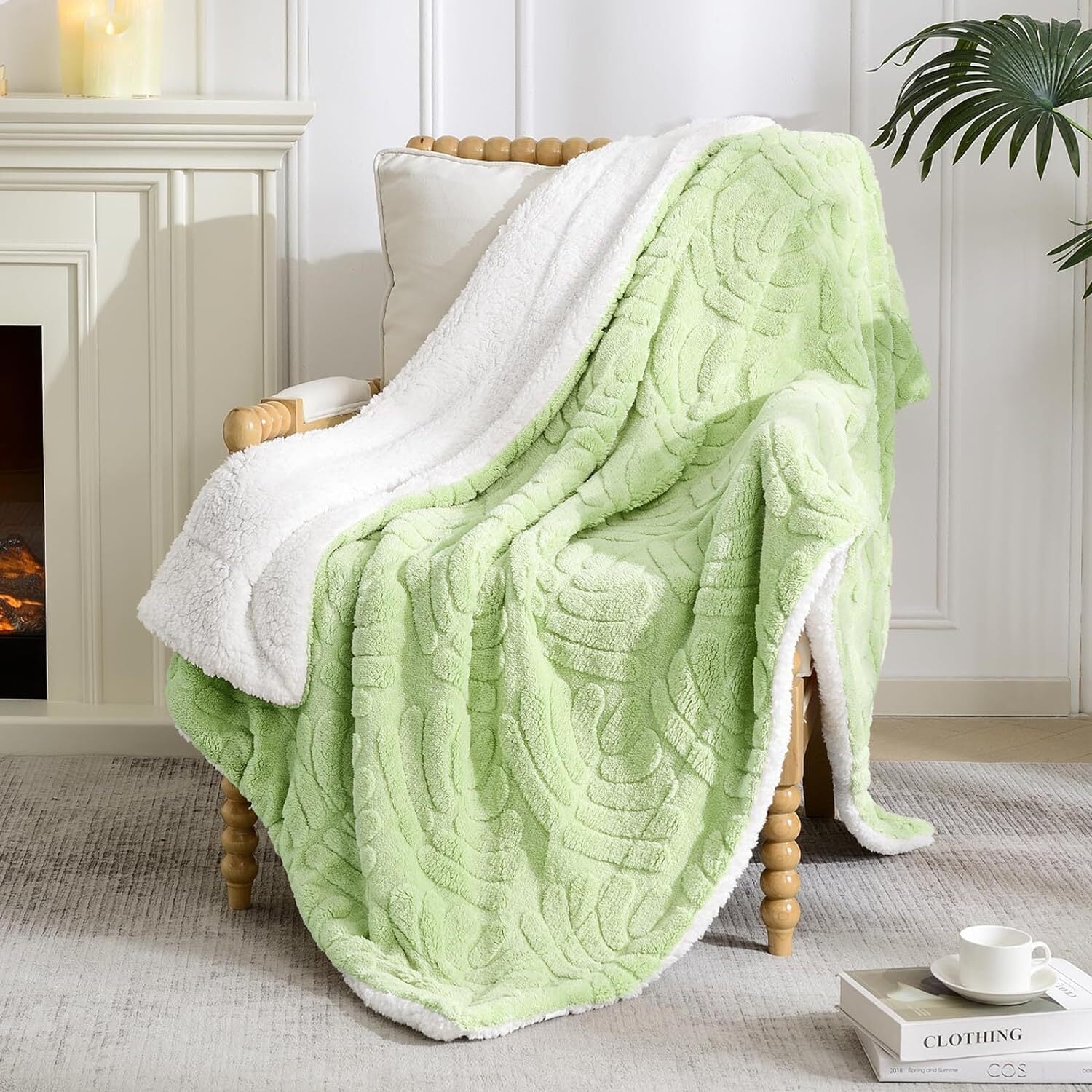 Plush and Soft: The luxury double layered sherpa blanket features 240gsm fuzzy fleece and 240gsm sherpa fabric that offers pleasant warmth and softness all year round, especially for fall and winterFashion and Stylish: The plush blanket is extremely comfortable and fashionable. It is designed with 3D jacquard pattern, which could add elegance and brightness to your room. In addition, we also offer a variety of colors and sizes for you to choose from, which easily matches your home decor.Versatile Usage: The stylish blanket is oversized 50x70 inch. It not only provides warmth as a thick blanket at night, but also can be used as a personalized throw when you take a nap or watch TV on the sofa. The blanket is lightweight and easy to carry as a travel blanket and camping blanket. More than that, it could be considered as bedspreads, coverlets, sofa cover and so on.Gift Ideas for Family: Our throw blanket with appealing design and soft tactile will greatly impress your loved ones, that would be such a great idea as Christmas gift for your family and friends.Washing Instruction: Durable material makes the blanket machine washable and dryer friendly. Machine wash cold and tumble dry low. No shedding, shrinking or fading after wash. Tips: this fluffy throw blankets are tightly packaged to protect environment. After taking it out from the compact package, please shake it gently and wait a few hours to be more fluffy.