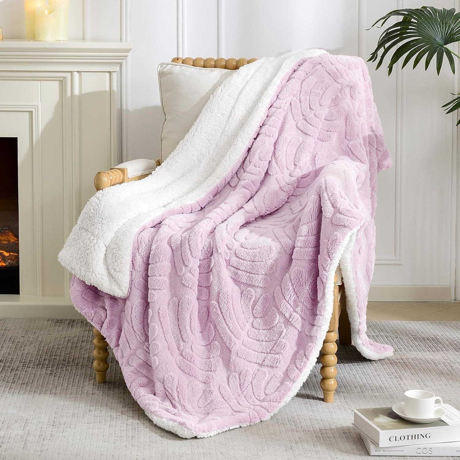 Plush and Soft: The luxury double layered sherpa blanket features 240gsm fuzzy fleece and 240gsm sherpa fabric that offers pleasant warmth and softness all year round, especially for fall and winterFashion and Stylish: The plush blanket is extremely comfortable and fashionable. It is designed with 3D jacquard pattern, which could add elegance and brightness to your room. In addition, we also offer a variety of colors and sizes for you to choose from, which easily matches your home decor.Versatile Usage: The stylish blanket is oversized 50x70 inch. It not only provides warmth as a thick blanket at night, but also can be used as a personalized throw when you take a nap or watch TV on the sofa. The blanket is lightweight and easy to carry as a travel blanket and camping blanket. More than that, it could be considered as bedspreads, coverlets, sofa cover and so on.Gift Ideas for Family: Our throw blanket with appealing design and soft tactile will greatly impress your loved ones, that would be such a great idea as Christmas gift for your family and friends.Washing Instruction: Durable material makes the blanket machine washable and dryer friendly. Machine wash cold and tumble dry low. No shedding, shrinking or fading after wash. Tips: this fluffy throw blankets are tightly packaged to protect environment. After taking it out from the compact package, please shake it gently and wait a few hours to be more fluffy.