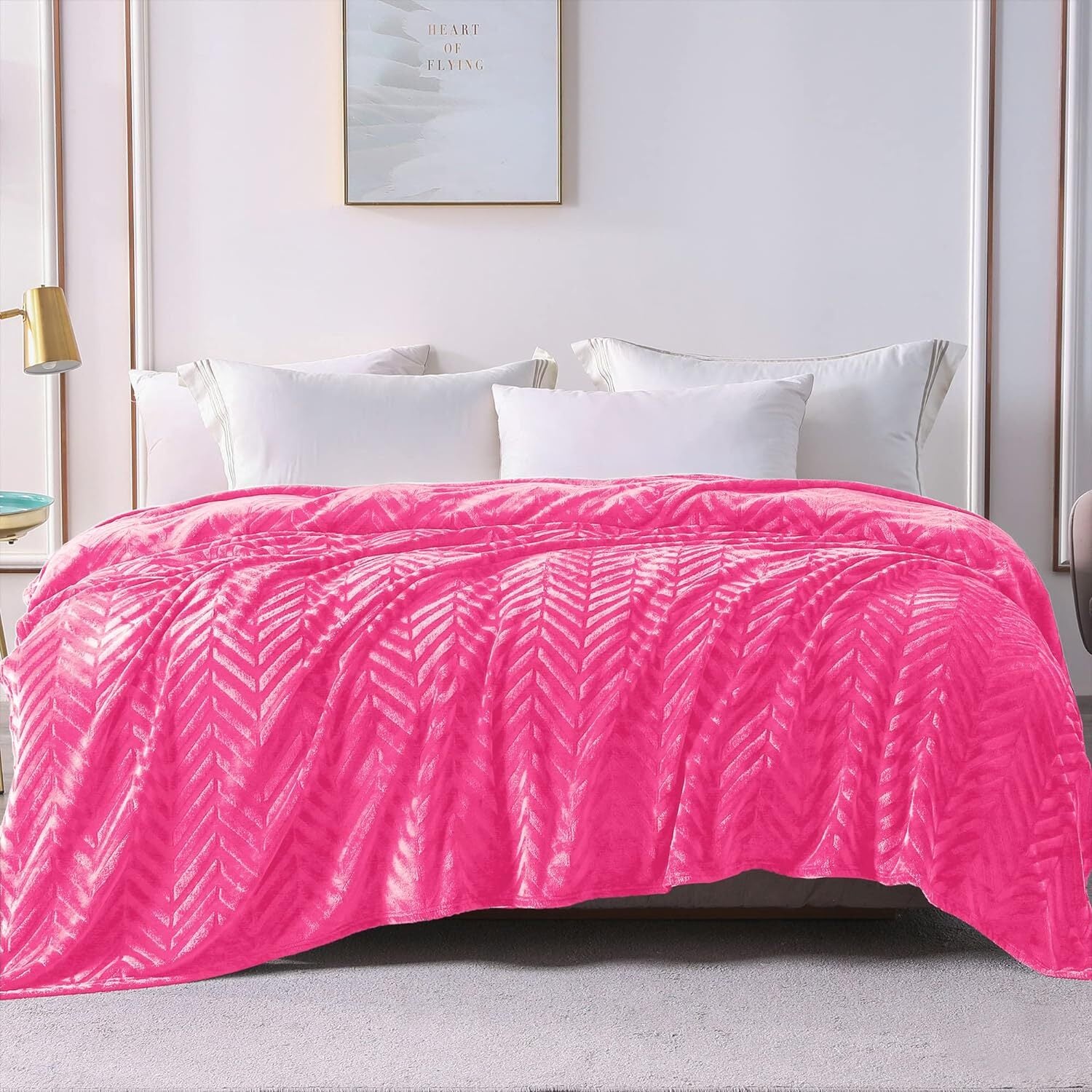 Whale Flotilla Flannel Fleece Twin Size Bed Blanket, Soft Velvet Lightweight Bedspread Plush Fluffy Coverlet Chevron Design Decorative Blanket for All Season, 90x66 Inch, Hot Pink