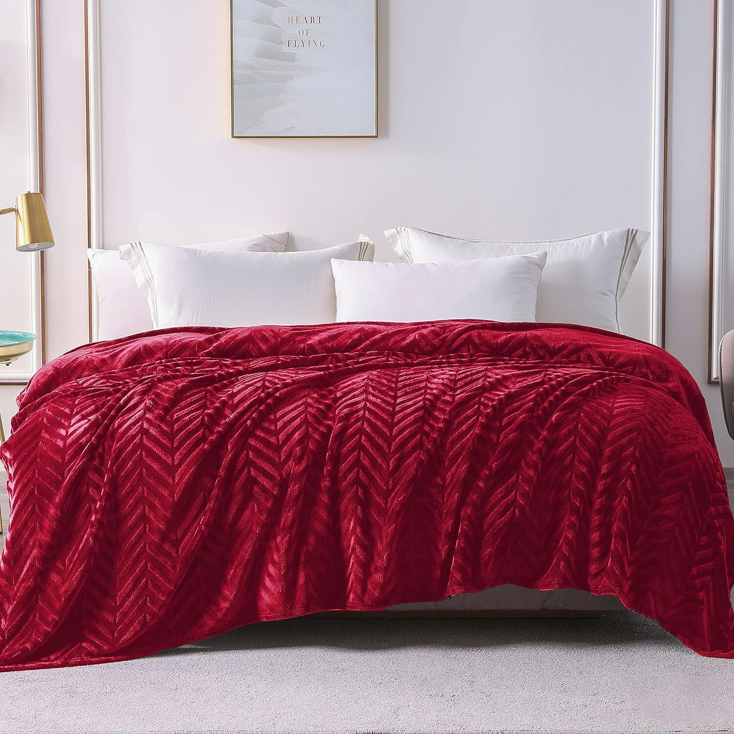 Whale Flotilla Flannel Fleece Queen Size Bed Blanket, Soft Velvet Lightweight Bedspread Plush Fluffy Coverlet Chevron Design Decorative Blanket for All Season, 90x90 Inch, Red