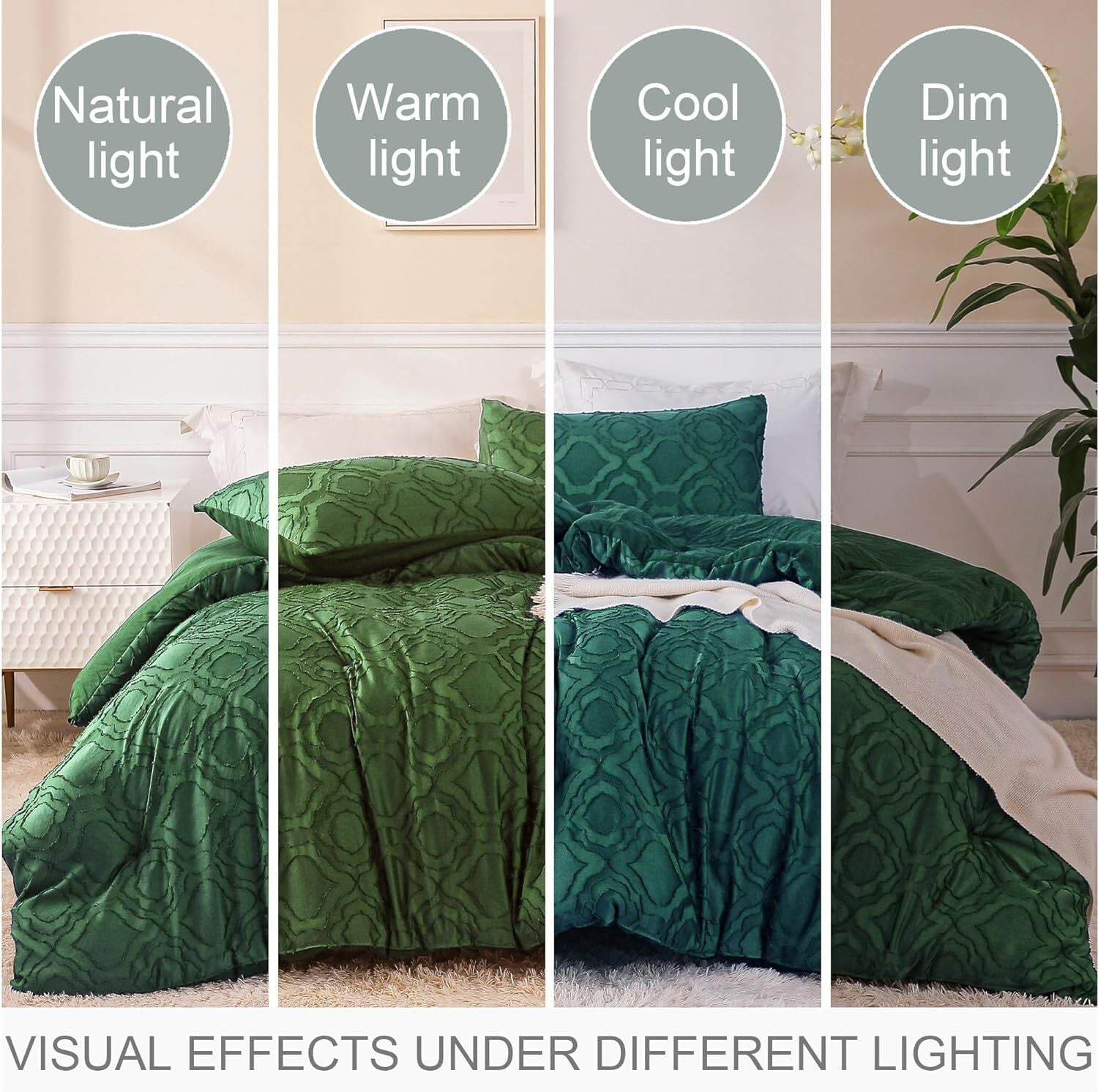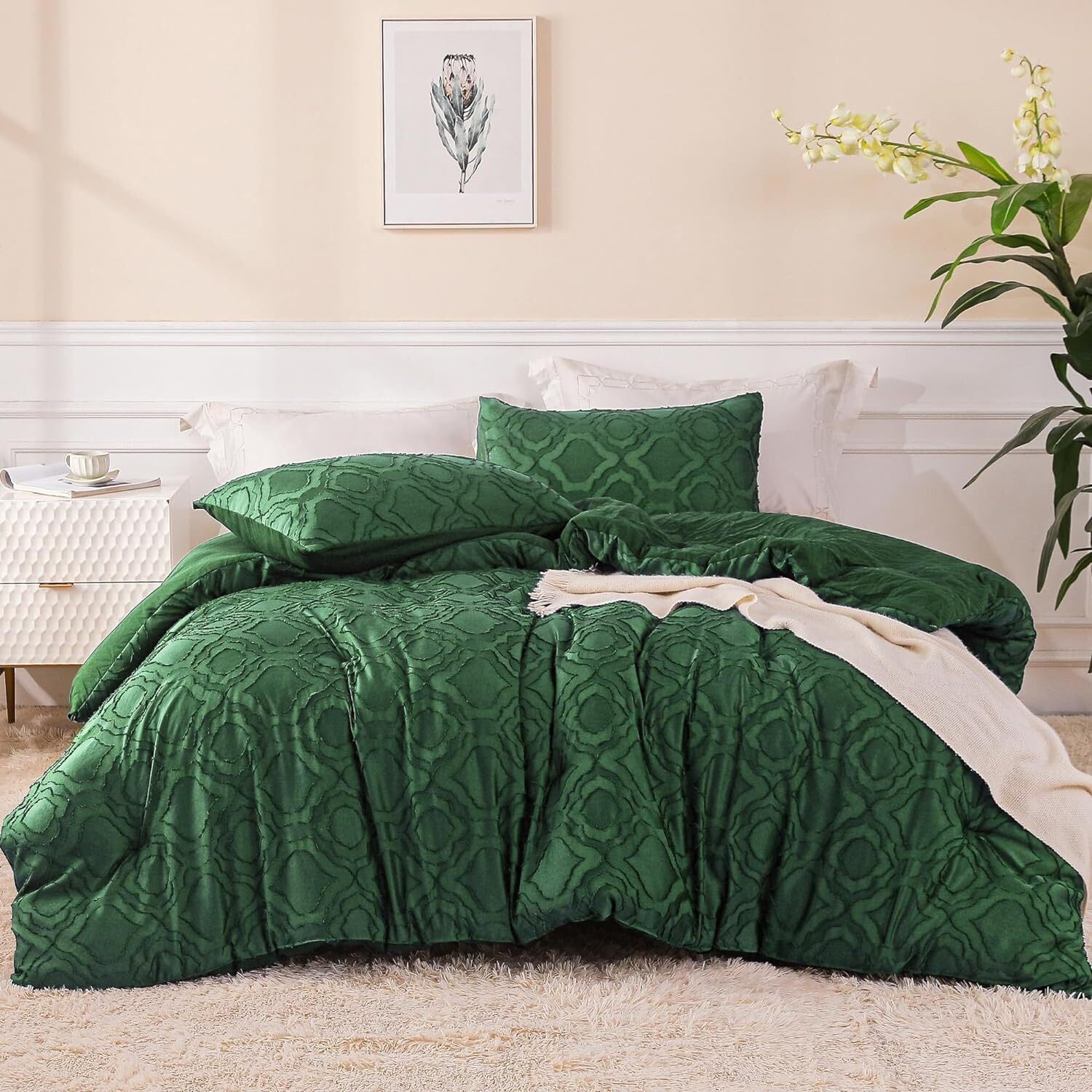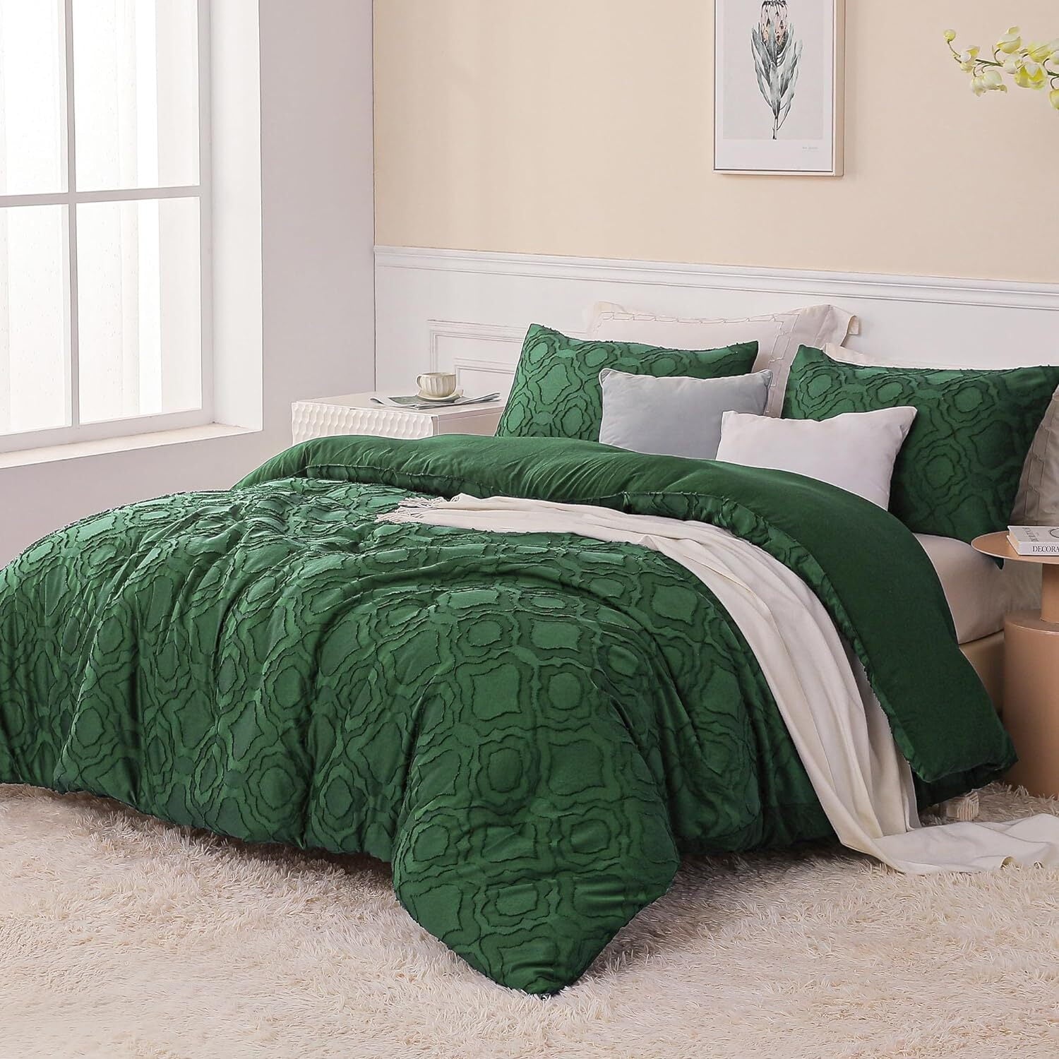 Whale Flotilla 3-Piece Tufted Queen Comforter Set, Soft Fluffy Shabby Chic Comforter for All Seasons, Farmhouse Boho Duvet Bedding Sets with 2 Pillow Shams, 90"x90", Deep Green
