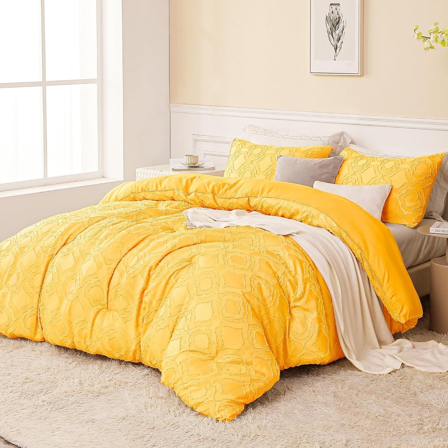 Whale Flotilla 3-Piece Tufted Queen Comforter Set, Soft Fluffy Shabby Chic Comforter for All Seasons, Farmhouse Boho Duvet Bedding Sets with 2 Pillow Shams, 90"x90", Yellow