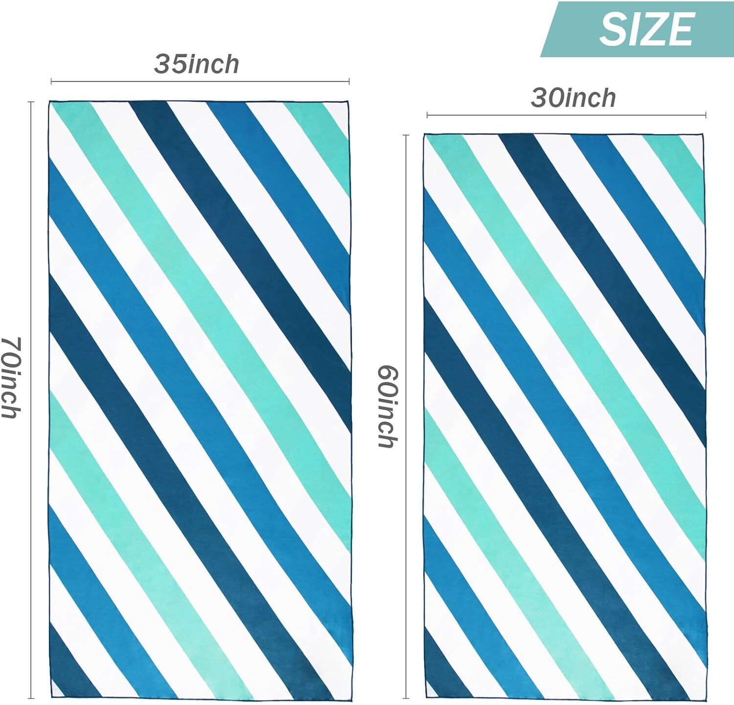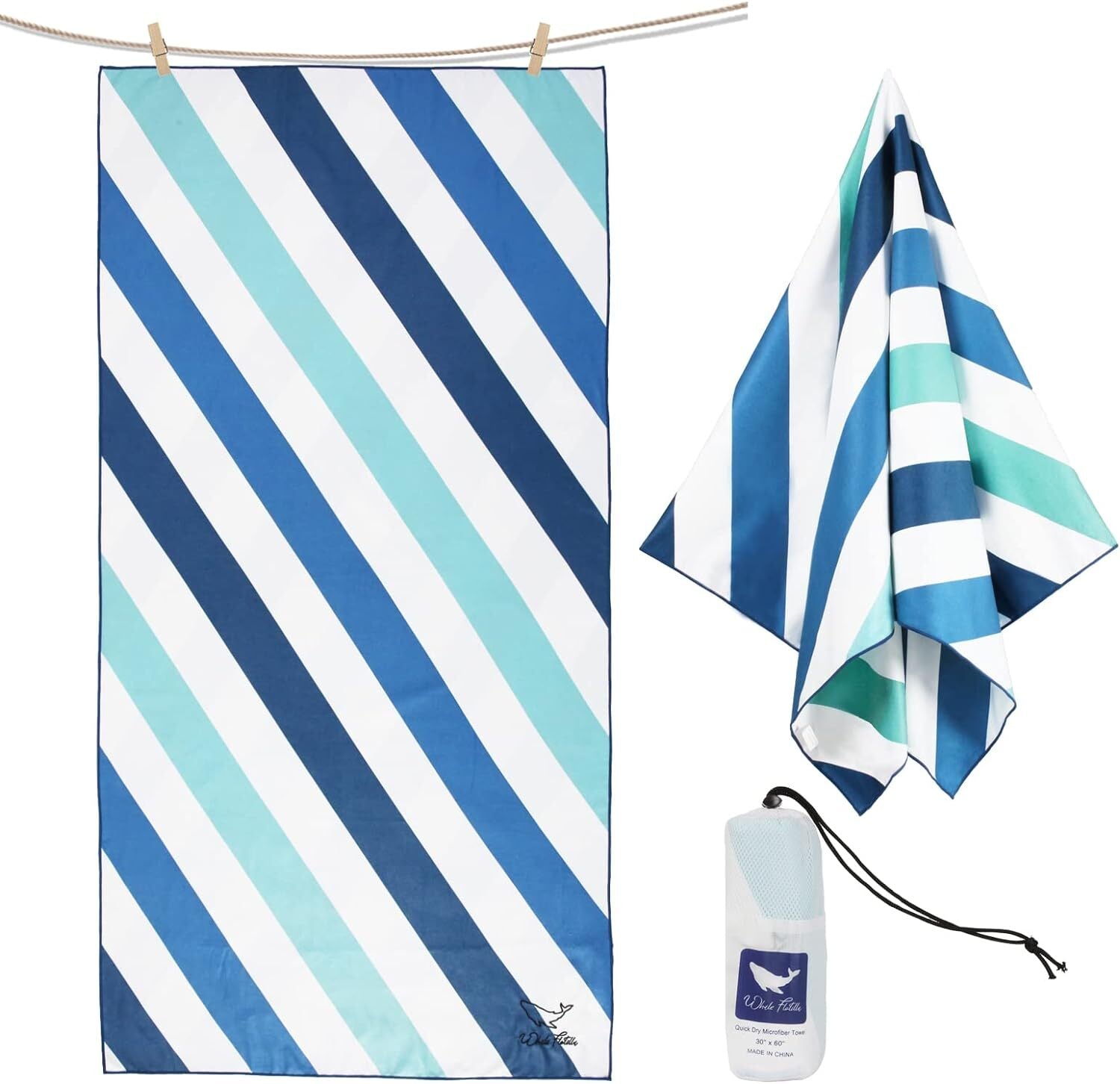 SIZE: This large-size (30?\X60?\) beach towel is very compact and lightweight with an adorable bag, easy to pack and carry. It could fold down to maximize space in your luggage or closet, lightening your burden in travel.SIZE: This large-size (30?\X60?\) beach towel is very compact and lightweight with an adorable bag, easy to pack and carry. It could fold down to maximize space in your luggage or closet, lightening your burden in travel.DESIGN: With classic cabana stripes, bright colors and delicate embroidered logo of Whale Flotilla, this gorgeous beach towel is a perfect companion for sunbathing, making you an eye-catching and fashionable guy on the coast.ABSORBENT&SANDFREE: This beach towel soaks up water easily, and provides moisture-wicking control to keep your skin cool and dry. It is so smooth with a tight weave that makes sand and dust difficult to adhere to. You can easily shake the sand off even when it gets wet.CARE INSTRUCTION: Machine Wash Cold, Tumble Dry on Low, please wash it separately for the first time, and wash similar color of towel together, No Bleaching, No ironing