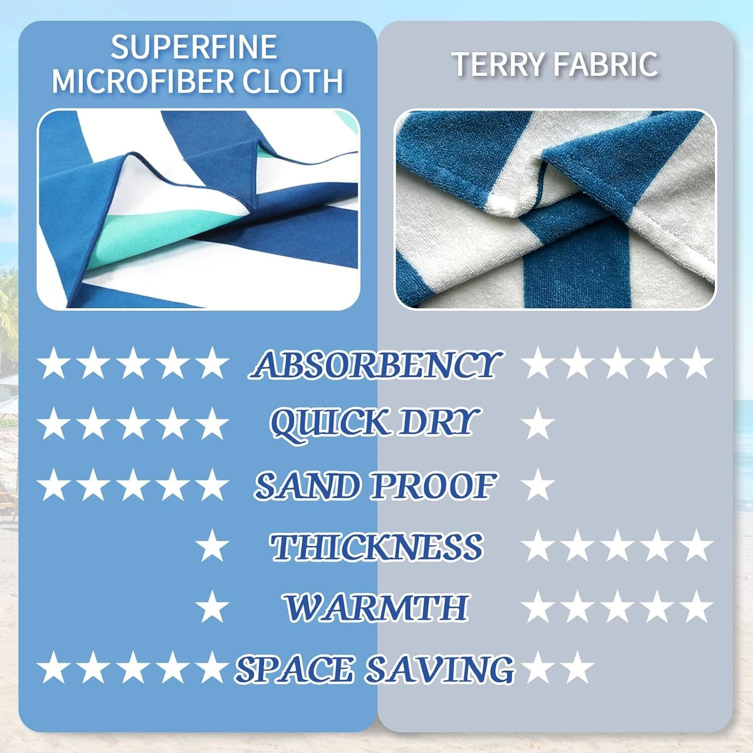 QUALITY: Made of 85% polyester and 15% polyamide, this beach towel is MORE LIGHTWEIGHT and THINNER than common towels. Compared to all cotton and 100% polyester beach towels, our beach towel has stronger water absorption and is more durable.