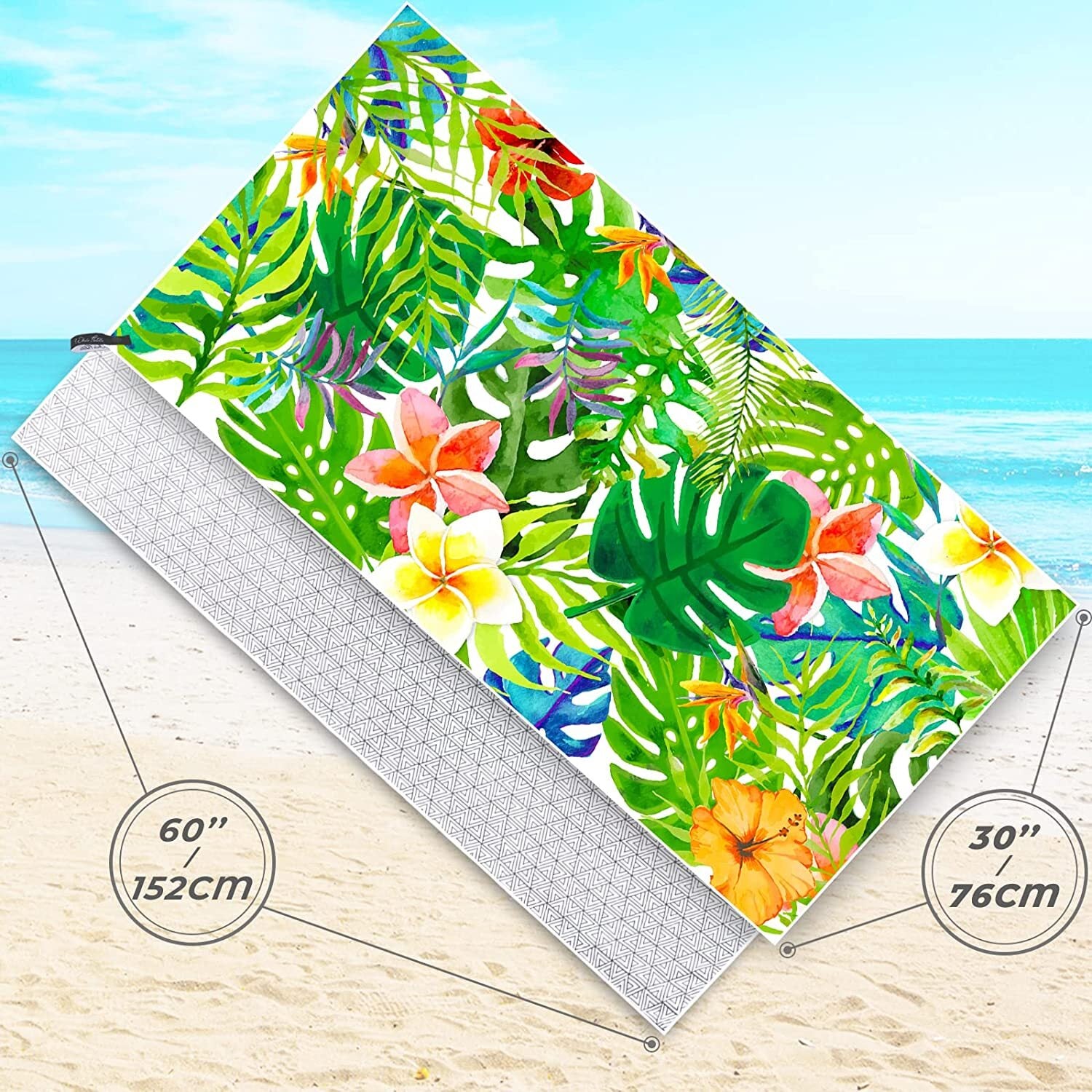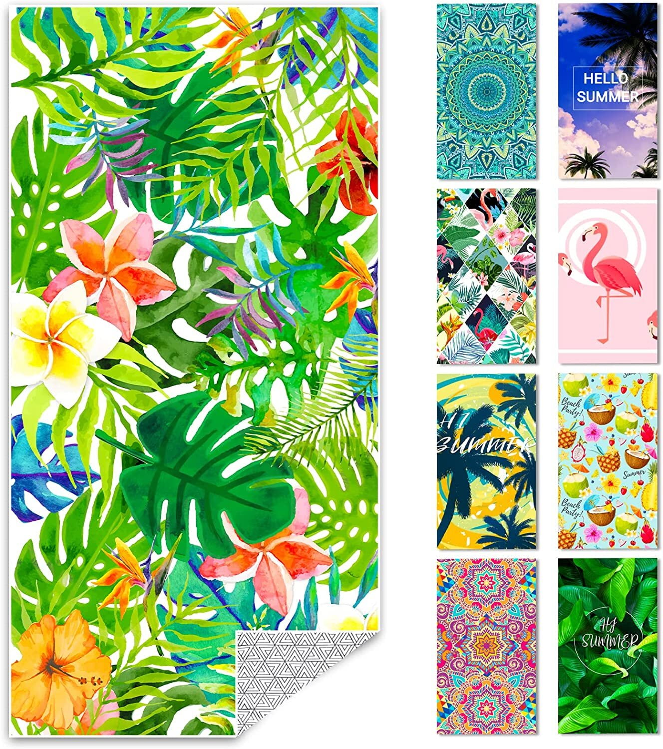 MICROFIBER MATERIAL: Made of 85% polyester and 15% polyamide. Our microfiber beach towels are softer and more absorbent which is not the same as normal towel material. It's smoother, thinner and more durable than cotton or terry cloth quality.SIZE: The fully-unfolded size of our large beach towel is 30??x60??, which is suitable for both adults and children.The folding size is 7.5??x2.5??, which is smaller and more portable. Maximize luggage or closet space to reduce your travel burden.DESIGN: Adopted with digital printing technology, our microfiber beach towel??s patterns are clear and delicate, maintaining bright and no-fading features. With these stylish patterns covered, you will have a memorable summer time with your friends and families. Perfect gift ideas for birthday or parties.MULTI-PURPOSE:Sand-free and quick dry, our beach towel is perfect for working out, swimming, surfing,sunbathing, camping, travel, yoga or pilates.EASY CARE: Machine Wash Cold, Tumble Dry on Low, please wash it separately for the first time, and wash similar color of towel together, No Bleaching, No ironing.