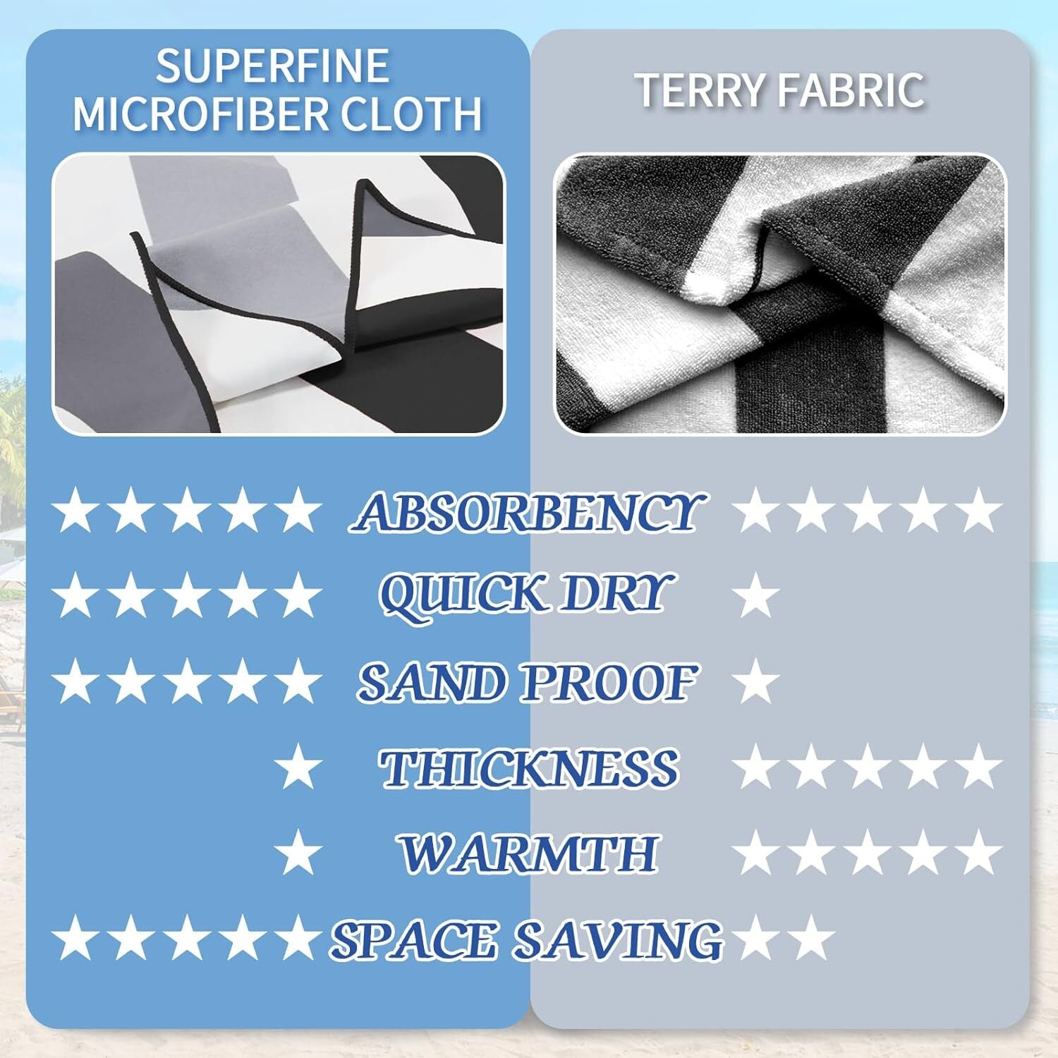 QUALITY: Made of 85% polyester and 15% polyamide, this beach towel is MORE LIGHTWEIGHT and THINNER than common towels. Compared to all cotton and 100% polyester beach towels, our beach towel has stronger water absorption and is more durable.
