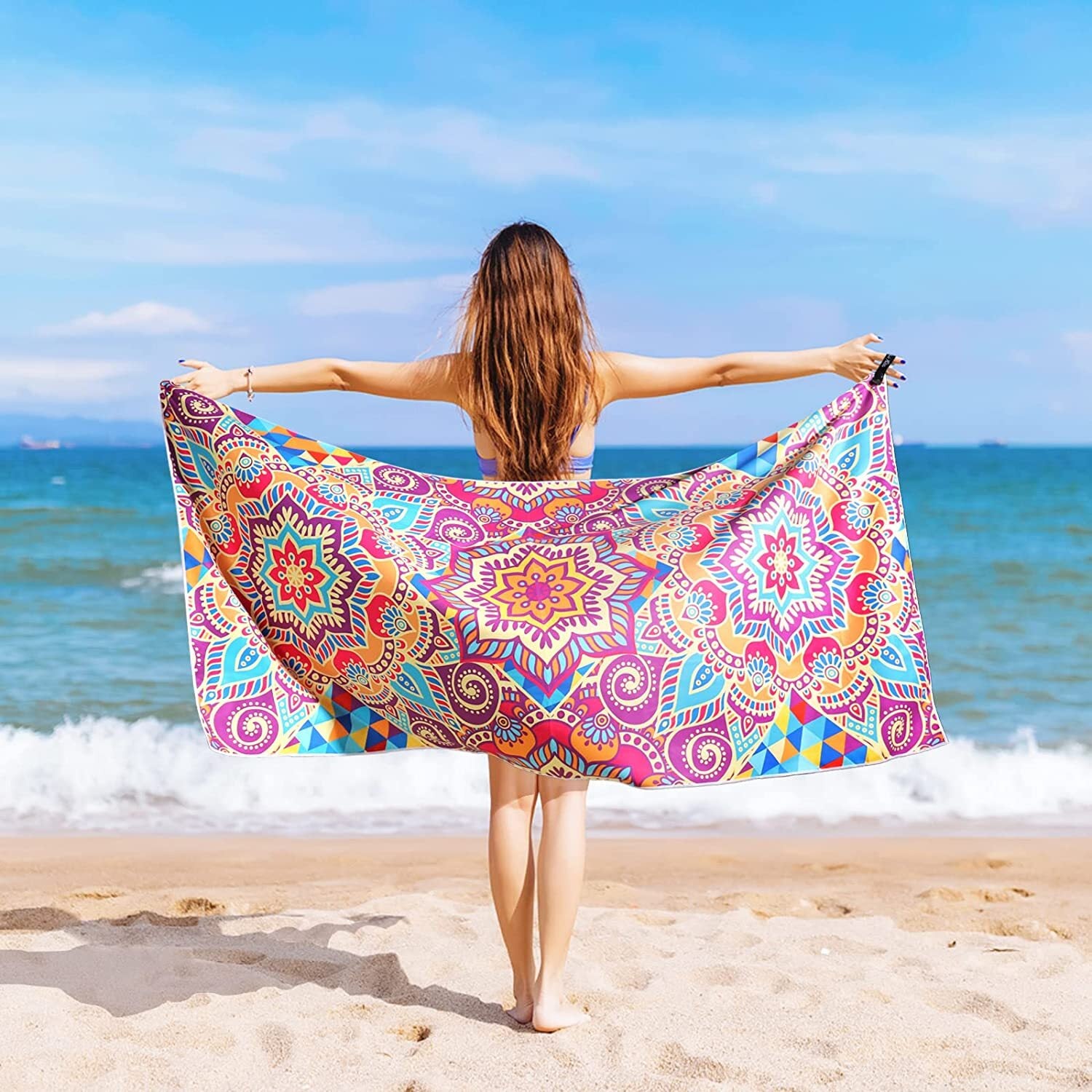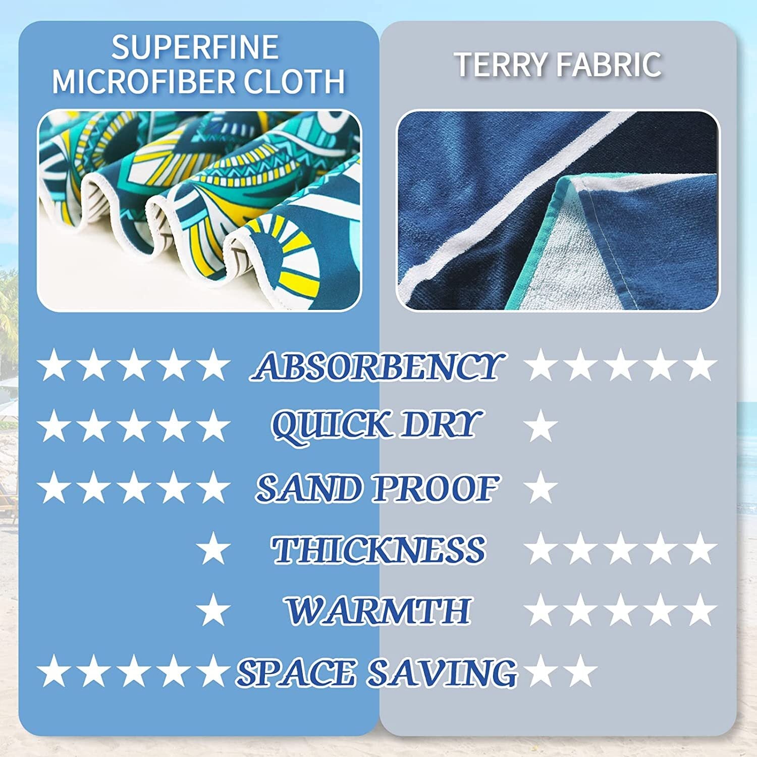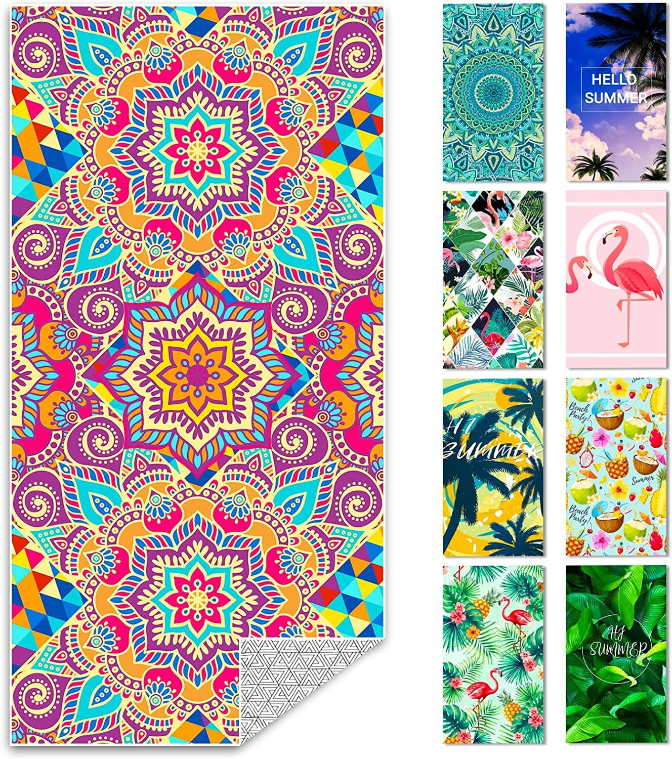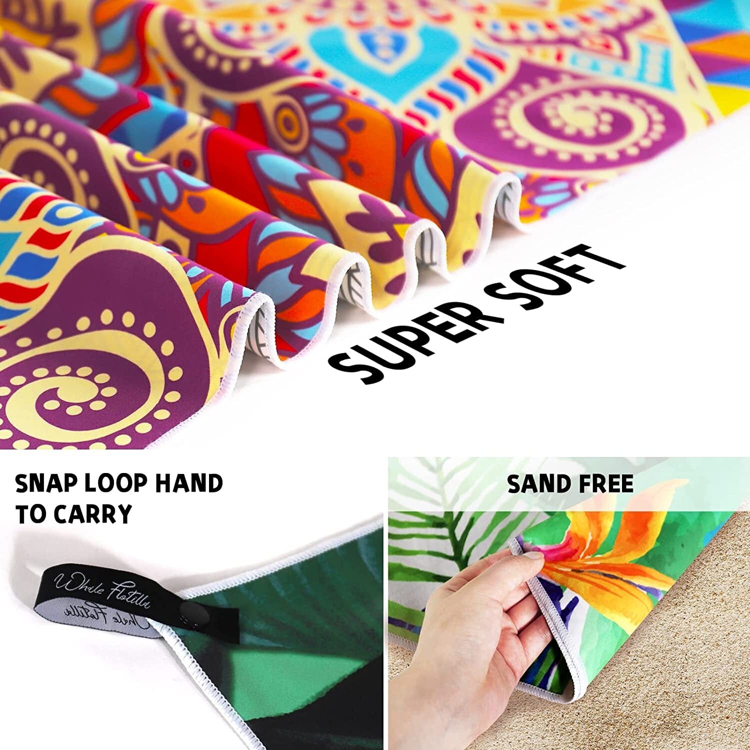 MICROFIBER MATERIAL: Made of 85% polyester and 15% polyamide. Our microfiber beach towels are softer and more absorbent which is not the same as normal towel material. It's smoother, thinner and more durable than cotton or terry cloth quality.SIZE: The fully-unfolded size of our large beach towel is 30??x60??, which is suitable for both adults and children.The folding size is 7.5??x2.5??, which is smaller and more portable. Maximize luggage or closet space to reduce your travel burden.DESIGN: Adopted with digital printing technology, our microfiber beach towel??s patterns are clear and delicate, maintaining bright and no-fading features. With these stylish patterns covered, you will have a memorable summer time with your friends and families. Perfect gift ideas for birthday or parties.MULTI-PURPOSE:Sand-free and quick dry, our beach towel is perfect for working out, swimming, surfing,sunbathing, camping, travel, yoga or pilates.EASY CARE: Machine Wash Cold, Tumble Dry on Low, please wash it separately for the first time, and wash similar color of towel together, No Bleaching, No ironing.