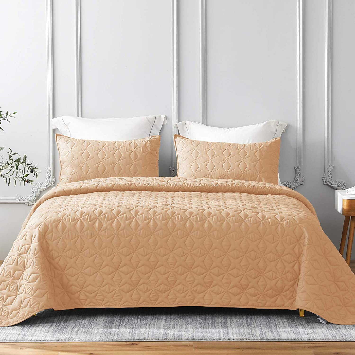 QUALITY FABRIC£o100% Microfiber quality brushed microfiber and soft polyester filling make the quilt soft and comfortable. The lightweight fabric is suitable for all seasons, perfect for summer hot nights. In winter, you can add a comforter underneath to have warmer and sweeter dreams. PROPER-SIZED£oThe king quilt set includes one quilt (96"x104"), two king pillow shams (20"x36"). Compared to other twin quilt, the quilt, long enough to cover the edges of the bed, fits the bed perfectly. PERFECT HOME DECORATION£oDelicate geometric quilted stitching in solid color. The color and quilting design are exactly as pictured, easy to match your bedroom decor and adds a nice pop of color. A prefect choice for your home decoration. PERFECT FOR FAMILIES WITH CHILDREN AND PETS: The quilt is soft enough to provide extremely comfortable care for children. It is durable enough to stand up against the wear and continuous washing. It washes great and doesn't hold pet hair. EASY-CLEAN: Machine wash in cold water on gentle cycle, only non-chlorine bleach when needed, tumble dry on low heat. No shrinkage, No pilling, No colour fading and No unravelling after washing.Share