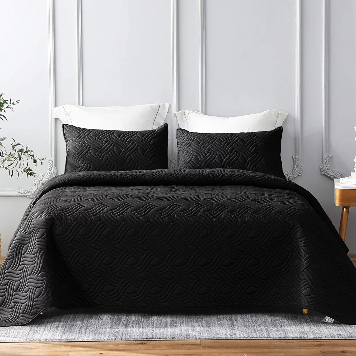 Whale Flotilla 3 Pieces Quilt Set King Size, Soft Microfiber Lightweight Bedspread Coverlet Bed Cover (Wave Pattern) for All Seasons, Black