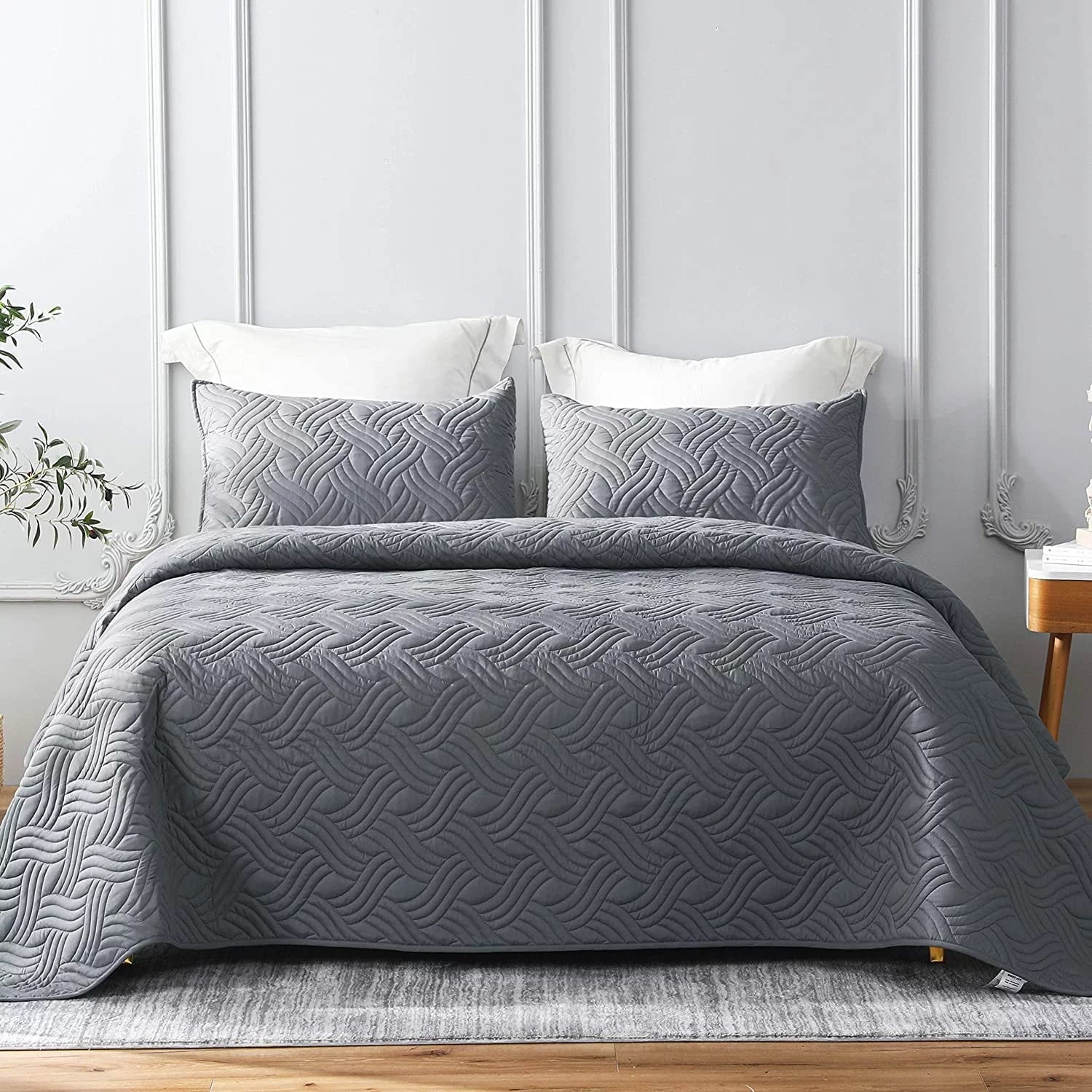 The king quilt set includes one quilt (96"x104"), two king pillow shams (20"x36"). Compared to other king quilt, the quilt is long enough to cover your bed. If you need a quilt that drapes all the way to the floor, you may have a low bed or choose a larger size. Made of well-made brushed microfiber and the filling is 140 GSM polyester, which is suitable for all seasons. This quilt is soft,lightweight and durable. Delicate geometric quilted stitching in solid color, easy to match your bedroom decor, providing you an elegant and classic feeling. A prefect choice for your home decoration. Whale Flotilla provides perfect products for adults and kids. Reversible quilt is not too thick but keep you warm and comfortable year round. In the winter, you can add a comforter underneath. Lightweight, durable bedspread sets are perfect for family. Machine wash in cold water on gentle cycle, only non-chlorine bleach when needed, tumble dry on low heat. No shrinkage, No pilling, No colour fading and No unravelling after washing.Share