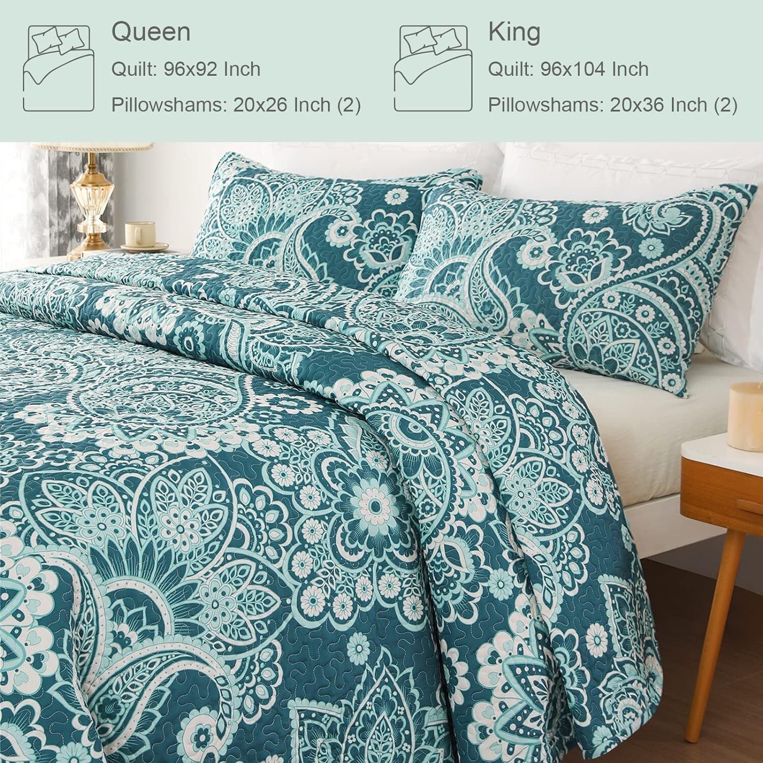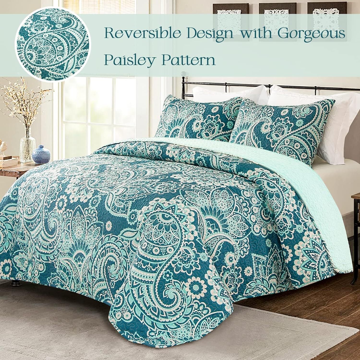 Whale Flotilla Reversible Paisley Quilts King Size, Lightweight Boho Printed Bedspreads Coverlets Quilt Bedding Set with 2 Pillow Shams for All Seasons, Turquoise