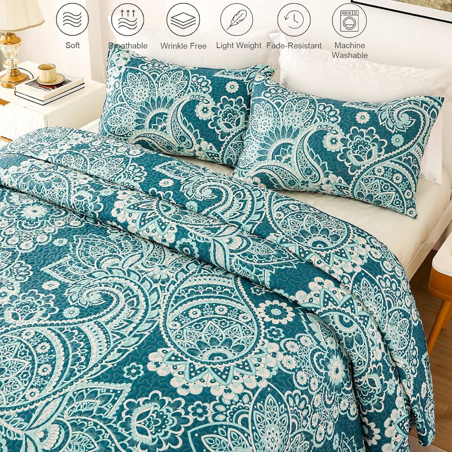 Whale Flotilla Reversible Paisley Quilts Full/Queen Size, Lightweight Boho Printed Bedspreads Coverlets Quilt Bedding Set with 2 Pillow Shams for All Seasons, Turquoise