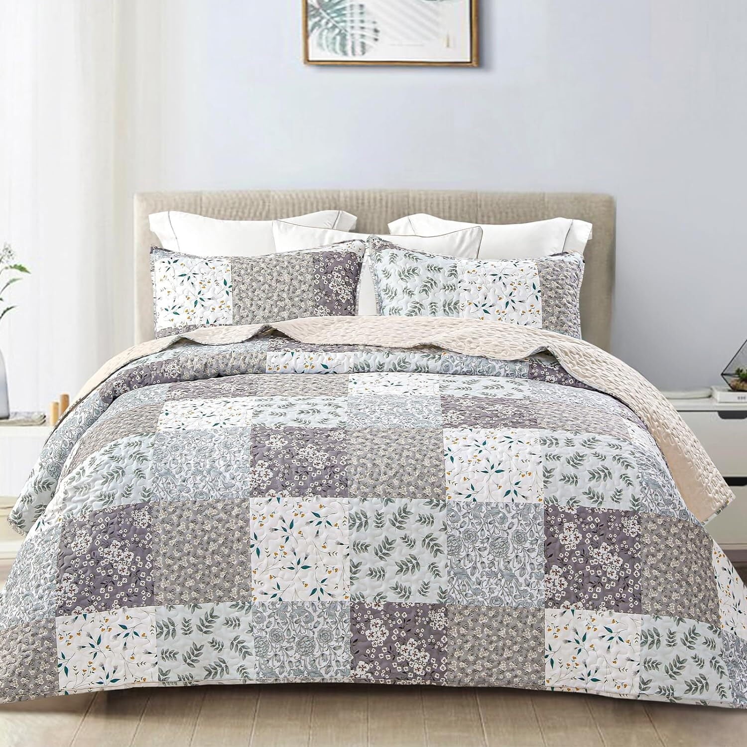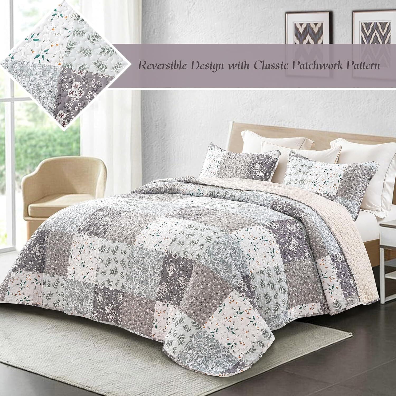 Classic Patchwork Patter and Exquisite Stitches.Digital printed pattern keeps bright color and pattern from fading. Sturdy for machinewash, no shedding and clumping after wash.High Quality: With exquisite stitching technology and well-made microfiber material, Whale Flotilla quilt set will give you the most comfortable skin touch, excellent softness and comfort without any pilling, fading or shrinkage.Color and size: The size of Queen Size Quilt is (96"x 92") with 2 pillowcases(20"x 26"), and King Size Quilt is (96"x 104") with 2 pillowcases(20"x 36"). It also comes in an array of colors, different colors have different styles and patterns to complement any style of home.Exquisite design: This quilt set is reversible with gorgeous patterns and vibrant color. Classic design with elegant pattern is printed on the front side, and the reverse side features bright solid color. The advanced digital printing technology makes the pattern much more beautiful and bright, a perfect ornament to your home decoration.Versatile Bedspread: Combined with practicality and beauty, our lightweight quilt set is your wonderful pick for indoor and outdoor use. It is a stylish ornament for your home decoration, a decent present for birthday, housewarming, Thanksgiving and Christmas party, or a cozy car accessory for long trip.Easy to Care: Machine wash in cold water on gentle cycle, only non-chlorine bleach when needed, tumble dry on low heat. No shrinkage, No pilling, No colour fading and No unraveling after washing.