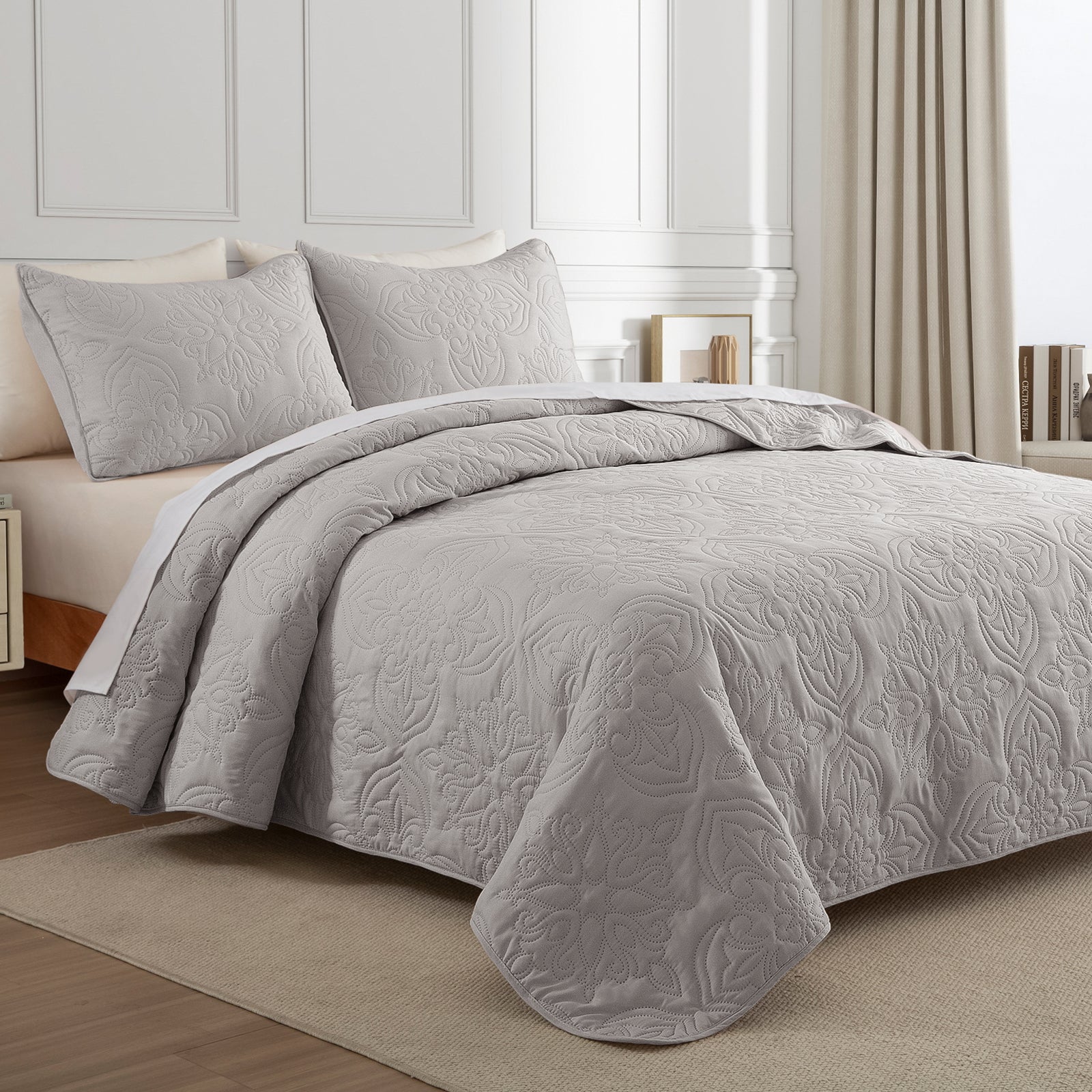Whale Flotilla Soft California King Quilt Bedding Set for All Seasons, Vintage Damask Ultrasonic Quilts Set, Lightweight Reversible Bedspread, Coverlet, Bed Cover with 2 Pillow Shams, Light Grey
