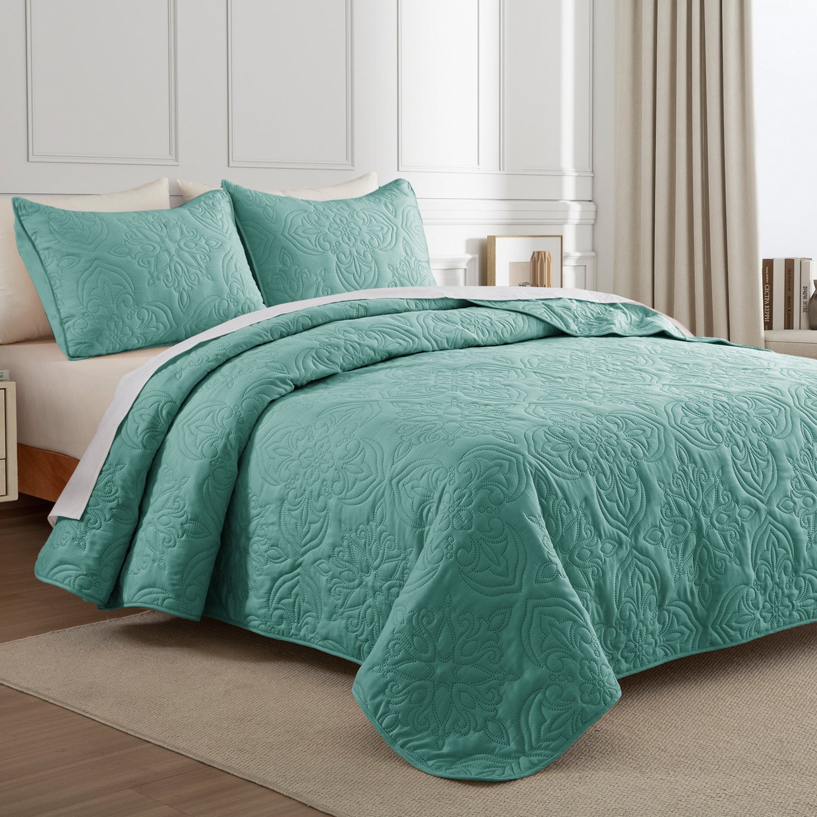 Whale Flotilla Soft King Quilt Bedding Set for All Seasons, Elegant Vintage Damask Ultrasonic Quilts Set, Lightweight Reversible Bedspread, Coverlet, Bed Cover with 2 Pillow Shams, Turquoise Green