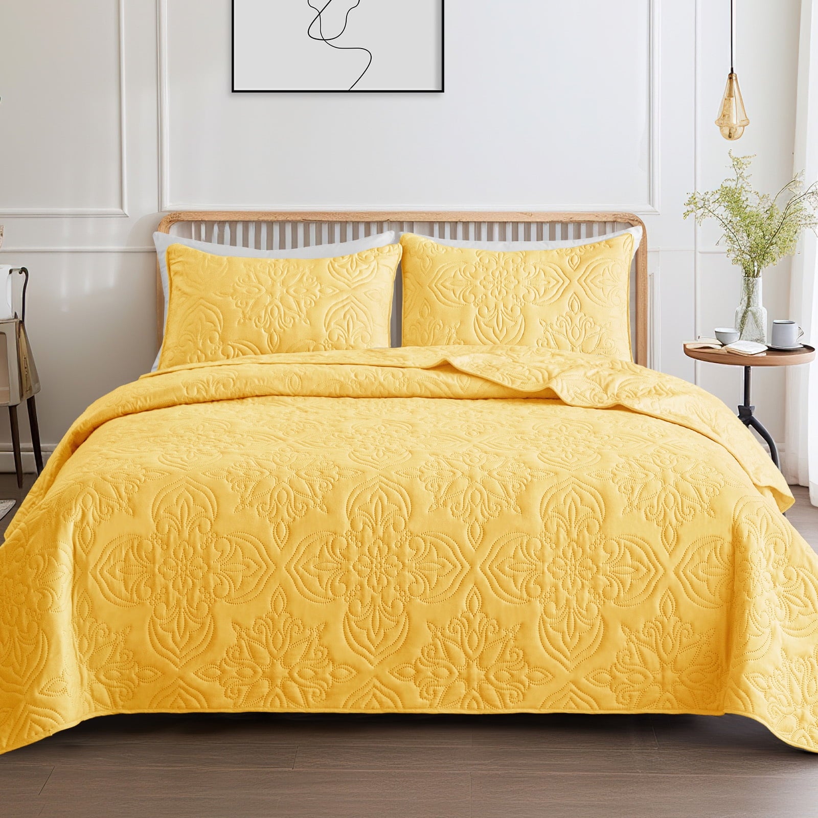 Whale Flotilla Soft King Quilt Bedding Set for All Seasons, Elegant Vintage Damask Ultrasonic Quilts Set, Lightweight Reversible Bedspread, Coverlet, Bed Cover with 2 Pillow Shams, Yellow