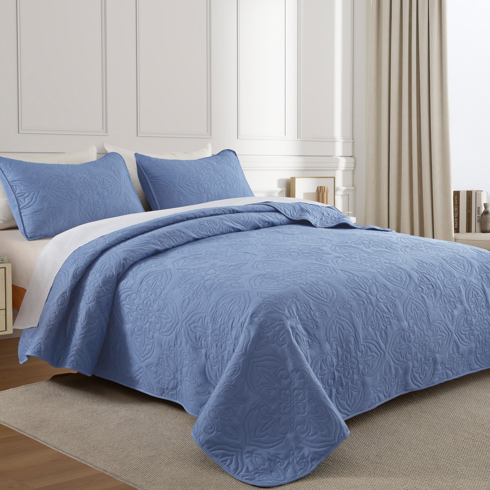 Soft material advanced technology: This ultrasonic quilts set is made of breathable lightweight microfiber polyester, suitable for all seasons. Different from traditional stitching quilts, this quilt adopts the latest ultrasonic stitching technology. It makes the quilt more cozy, comfortable and long lasting to useSize: This queen quilt set includes 1 bedspread (96 x 90 inches) and 2 pillowcases (20 x 26 inches). Measure your bed mattress and choose a suitable size to make it look like the pictures display effectExcellent home decor: This quilt set is unique in its elegant and innovative retro vintage damask flower pattern design. It also has multiple color options. Choose a color you like to decorate your living room, guest room or sofa couch more lively and stylishlyVersatile use: This quilt set is suitable for all seasons and can be used on both sides. When used in hot weather, it is breathable and will not make you feel stuffy; When used in cold weather, covering it to your comforter will bring you more warmthEasy care: Machine wash in cold water on gentle cycle, only non-chlorine bleach when needed, tumble dry on low heat. The filling material is tightly wrapped inside the quilt, which can withstand multiple washes without deformation. Wash it and pat it gently before the first use so as to have a more fluffy flatter and softer bed cover