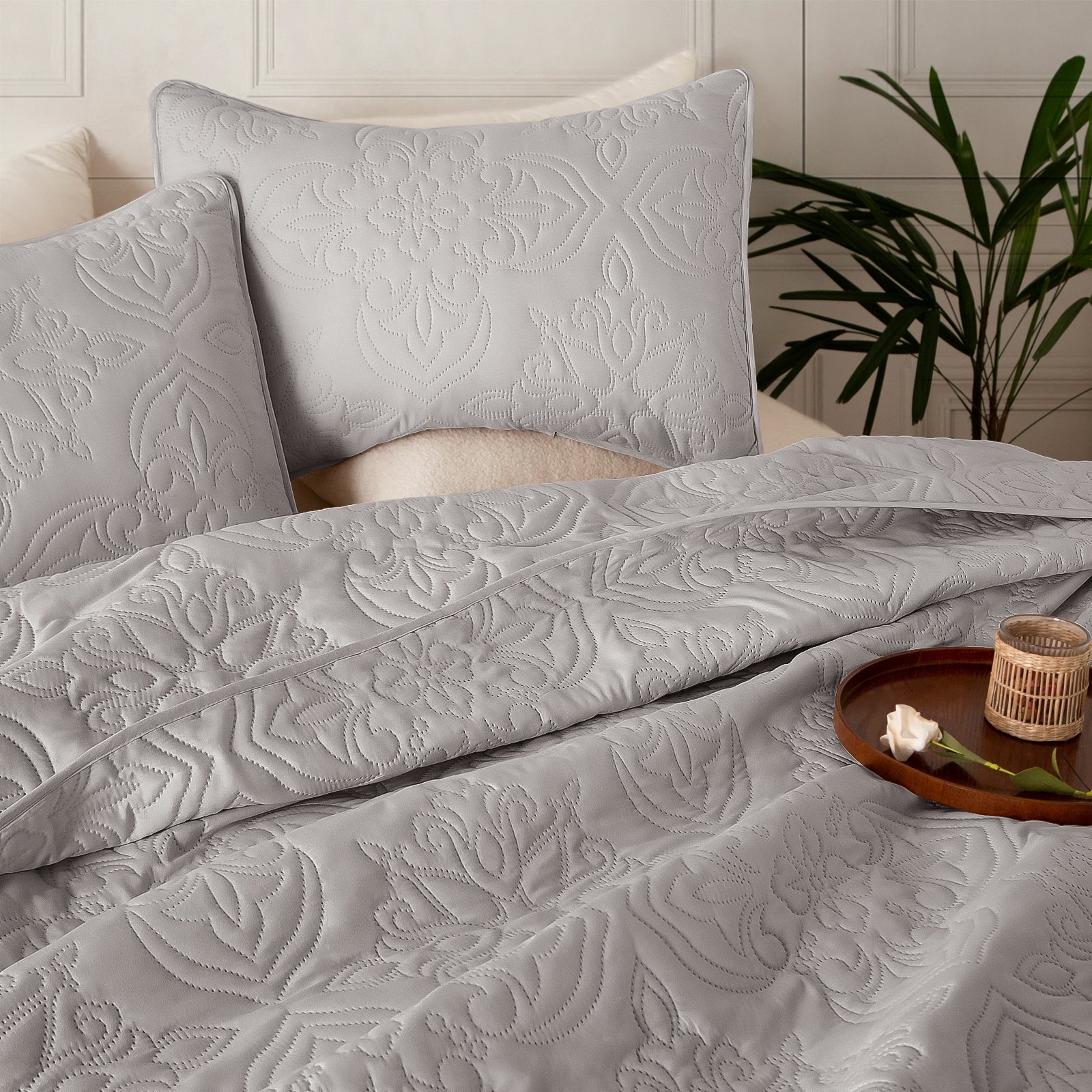 Soft material advanced technology: This ultrasonic quilts set is made of breathable lightweight microfiber polyester, suitable for all seasons. Different from traditional stitching quilts, this quilt adopts the latest ultrasonic stitching technology. It makes the quilt more cozy, comfortable and long lasting to useSize: This queen quilt set includes 1 bedspread (96 x 90 inches) and 2 pillowcases (20 x 26 inches). Measure your bed mattress and choose a suitable size to make it look like the pictures display effectExcellent home decor: This quilt set is unique in its elegant and innovative retro vintage damask flower pattern design. It also has multiple color options. Choose a color you like to decorate your living room, guest room or sofa couch more lively and stylishlyVersatile use: This quilt set is suitable for all seasons and can be used on both sides. When used in hot weather, it is breathable and will not make you feel stuffy; When used in cold weather, covering it to your comforter will bring you more warmthEasy care: Machine wash in cold water on gentle cycle, only non-chlorine bleach when needed, tumble dry on low heat. The filling material is tightly wrapped inside the quilt, which can withstand multiple washes without deformation. Wash it and pat it gently before the first use so as to have a more fluffy flatter and softer bed cover