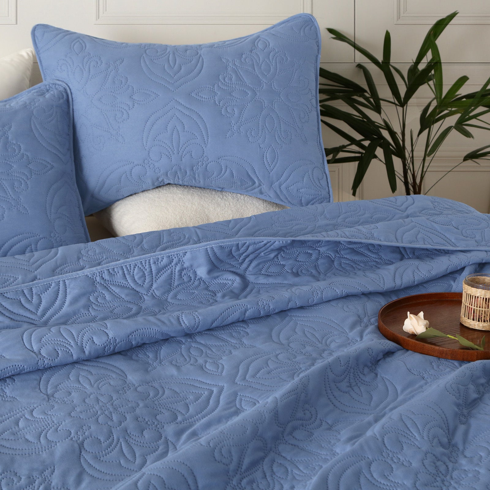 Soft material advanced technology: This ultrasonic quilts set is made of breathable lightweight microfiber polyester, suitable for all seasons. Different from traditional stitching quilts, this quilt adopts the latest ultrasonic stitching technology. It makes the quilt more cozy, comfortable and long lasting to useSize: This twin size quilt includes 1 bedspread (88 x 68 inches) and 1 pillowcase (20 x 26 inches). Measure your bed mattress and choose a suitable size to make it look like the pictures display effectExcellent home decor: This quilt set is unique in its elegant and innovative retro vintage damask flower pattern design. It also has multiple color options. Choose a color you like to decorate your living room, guest room or sofa couch more lively and stylishlyVersatile use: This quilt set is suitable for all seasons and can be used on both sides. When used in hot weather, it is breathable and will not make you feel stuffy; When used in cold weather, covering it to your comforter will bring you more warmthEasy care: Machine wash in cold water on gentle cycle, only non-chlorine bleach when needed, tumble dry on low heat. The filling material is tightly wrapped inside the quilt, which can withstand multiple washes without deformation. Wash it and pat it gently before the first use so as to have a more fluffy flatter and softer bed cover