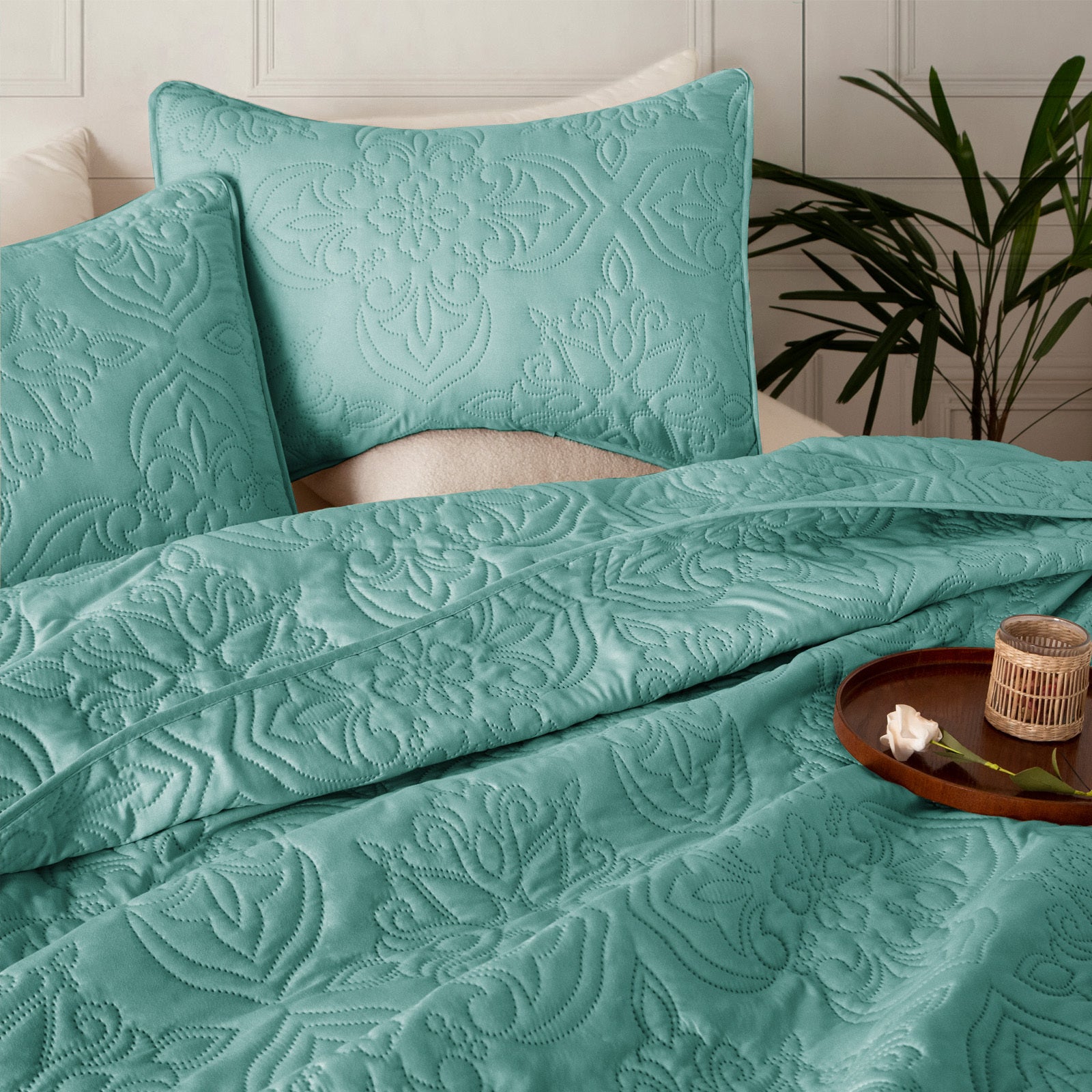 Soft material advanced technology: This ultrasonic quilts set is made of breathable lightweight microfiber polyester, suitable for all seasons. Different from traditional stitching quilts, this quilt adopts the latest ultrasonic stitching technology. It makes the quilt more cozy, comfortable and long lasting to useSize: This twin size quilt includes 1 bedspread (88 x 68 inches) and 1 pillowcase (20 x 26 inches). Measure your bed mattress and choose a suitable size to make it look like the pictures display effectExcellent home decor: This quilt set is unique in its elegant and innovative retro vintage damask flower pattern design. It also has multiple color options. Choose a color you like to decorate your living room, guest room or sofa couch more lively and stylishlyVersatile use: This quilt set is suitable for all seasons and can be used on both sides. When used in hot weather, it is breathable and will not make you feel stuffy; When used in cold weather, covering it to your comforter will bring you more warmthEasy care: Machine wash in cold water on gentle cycle, only non-chlorine bleach when needed, tumble dry on low heat. The filling material is tightly wrapped inside the quilt, which can withstand multiple washes without deformation. Wash it and pat it gently before the first use so as to have a more fluffy flatter and softer bed cover