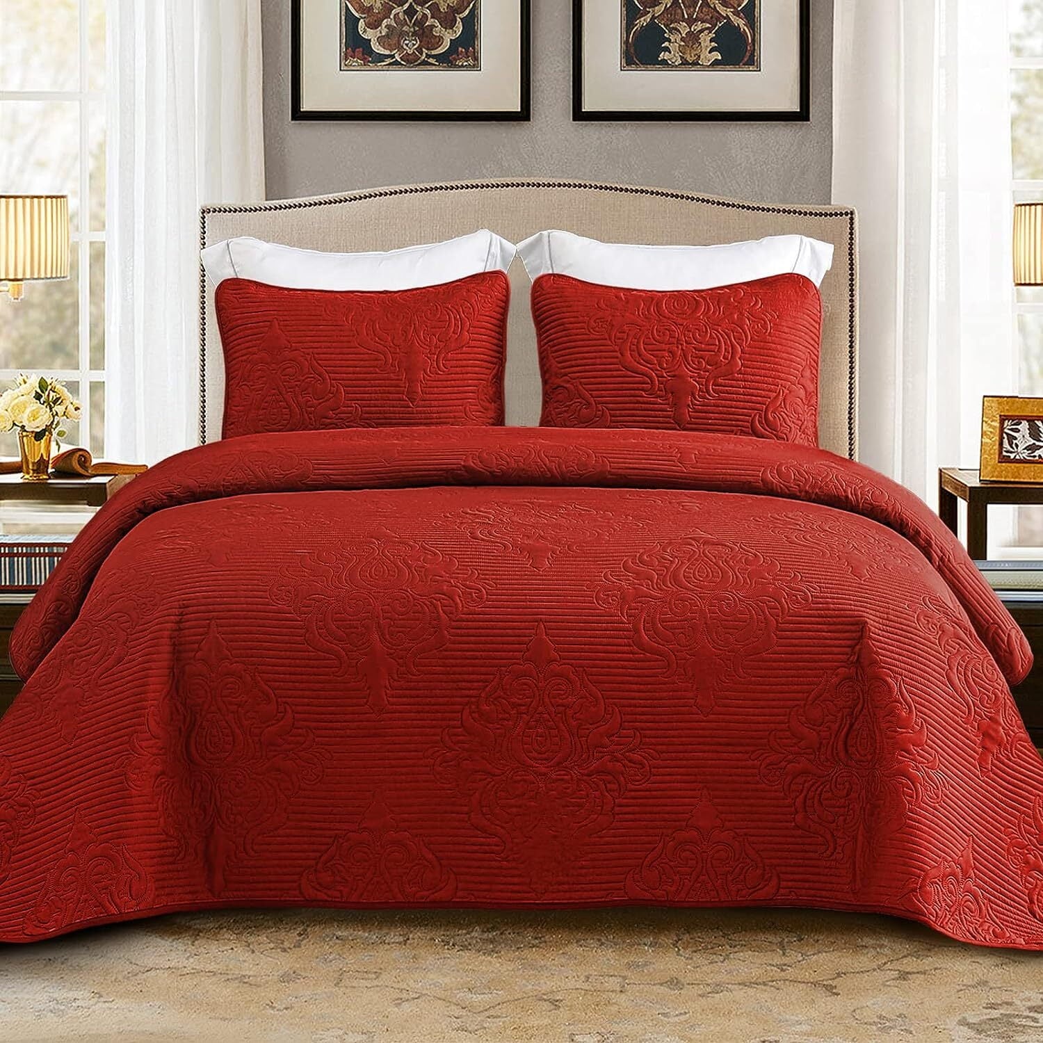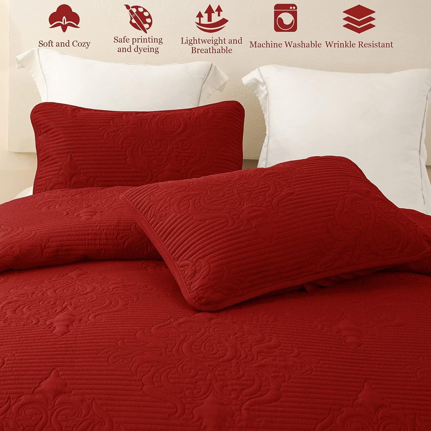 Whale Flotilla 2-Piece Twin Quilt Set, Soft Embossed Bedding Set, Lightweight Bedspread Coverlet with Damask Vintage Pattern, Reversible Bed Cover for All Seasons, Solid Red