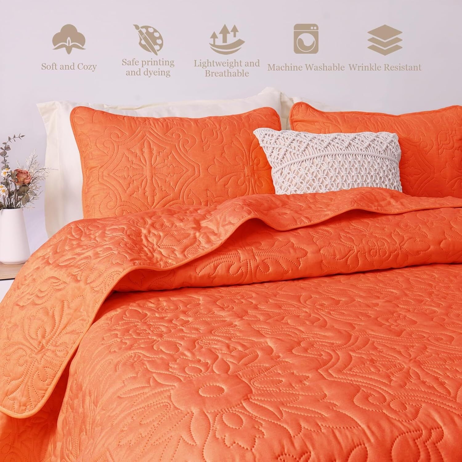Whale Flotilla 3-Piece Queen Quilt Set, Soft Embossed Bedding Set, Lightweight Bedspread Coverlet with Damask Vintage Pattern, Reversible Bed Cover for All Seasons, Burnt Orange