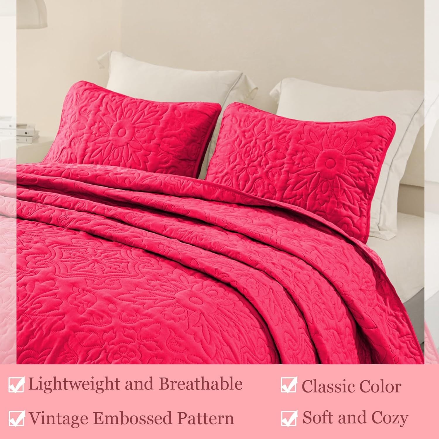 - Soft & Lightweight Coverlet: This ultra comfortable quilt bedding set is soft to the touch and light as a feather. Thanks to its breathable brushed polyester padding and cover, the lightweight coverlet is well suited for year-round use, especially kind to hot sleeper. Add a layer of comforter or blanket underneath if you want a more toasty and warm hug in cold winter.