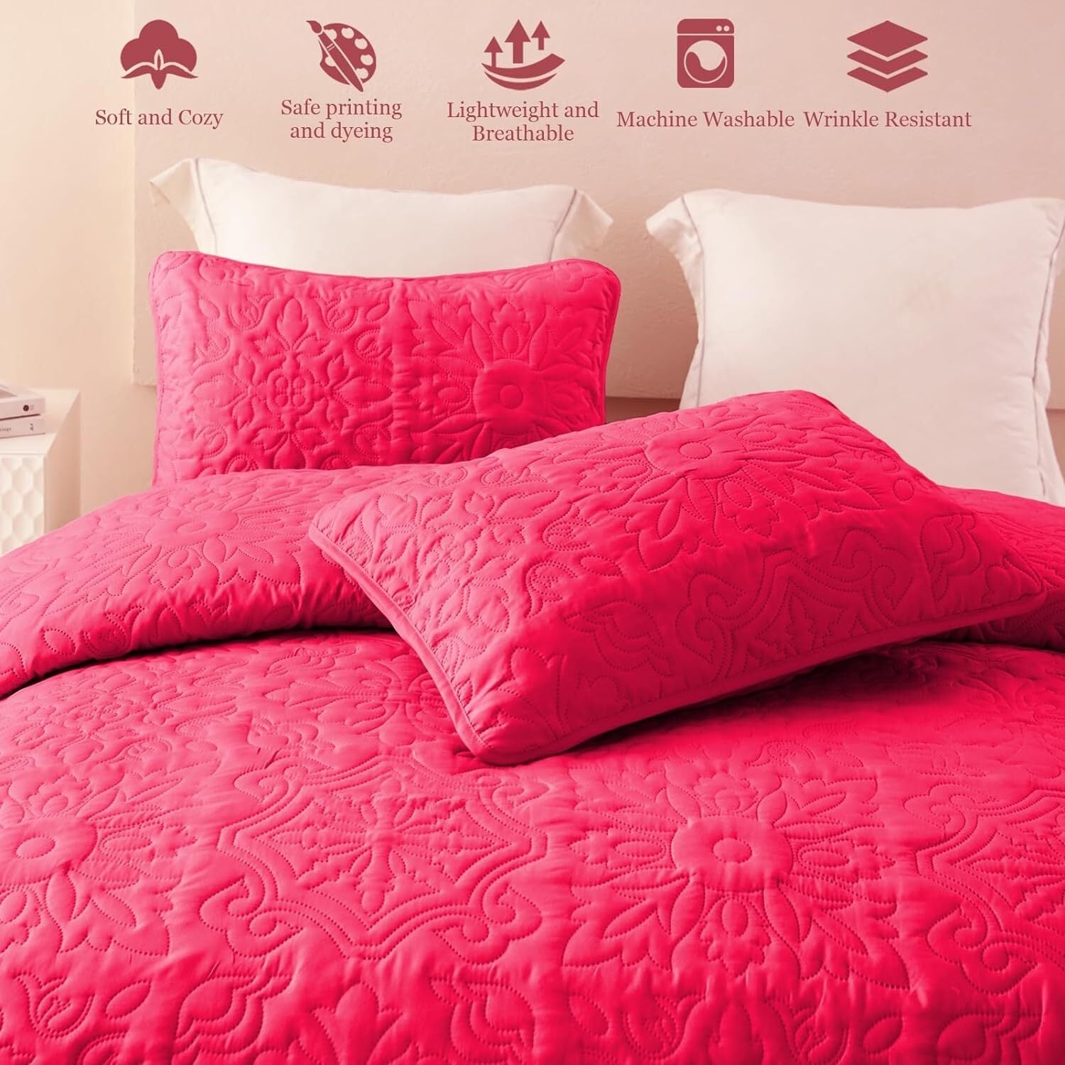 Whale Flotilla 3-Piece Queen Quilt Set, Soft Embossed Bedding Set, Lightweight Bedspread Coverlet with Damask Vintage Pattern, Reversible Bed Cover for All Seasons,Hot Pink