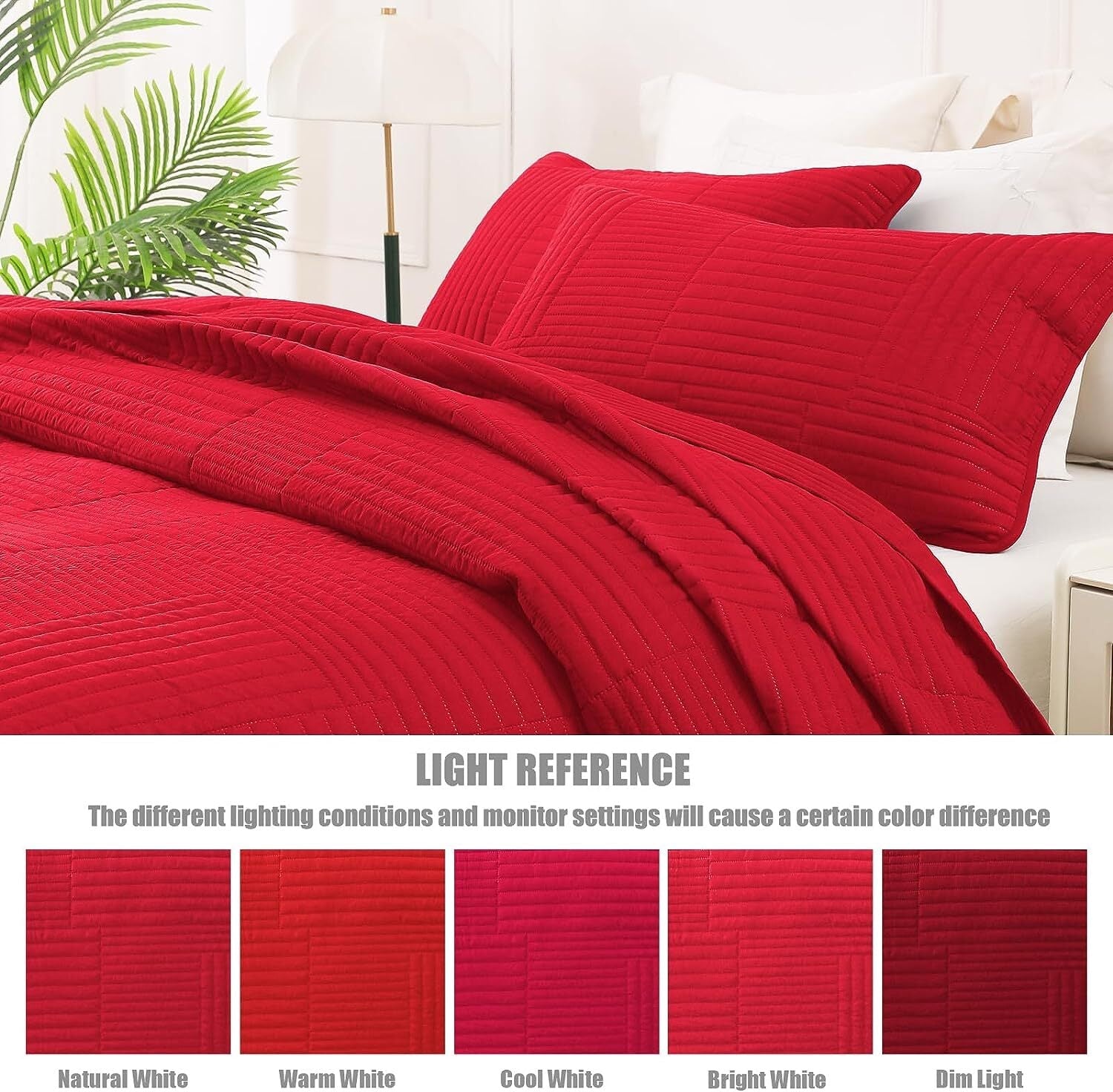 The soft and lightweight quilt set is made of breathable microfiber polyester, suitable for all seasons. The microfiber coverlet is durable, washable and dry-friendly. It holds up well in the wash, no fading, no pilling, no shedding, no deformation.It is a ultrasonic quilt bedding set that can be used as bed cover, coverlet and bedspread in bedroom, living room, guestroom.??Size?? Queen size quilt set includes 1 bedspread (96x90 inches) and 2 pillowcases (20x26 inches); King size quilt set includes 1 bedspread (104x96 inches) and 2 pillowcases (20x36 inches). Twin size quilt includes 1 bedspread (88x68 inches) and 1 pillowcase (20x36 inches). Measure your bed/mattress and choose a suitable size to make it drape nicely to the floor.??High-Quality Fabric??Quilt sets are filled with high quality microfibers. Premium microfiber bed covers are soft and comfortable, just like sleeping on a cloud. This extra soft and durable quilt features a lightweight construction which is perfect for layering. Not only that, ultrasonic stitching will not unravel and allows for many years of continued use.??Multi-occasion use??Used as quilt, bedspread, comforter set, blanket, bed cover etc. Perfect coverlet quilt for spring and autumn, or the hot summer and cold winter. Feeling a little cool in hot weather, and also can be used in winter as a blanket. Order 1 set and be used in all seasons. Enjoyed in the bedroom, guest room, kids room. Great gift idea for men and women, boys and girls, kids and teens at all ages!??Pretty Patterns??Quilted with plaid geometric patterns, this beautiful solid color bedspread stands out from plain ones, giving your bedroom and living room an elegant vibe.??Easy to Care??Premium quality fabric will not crumble and requires little care when washing, which saves your much time. Machine washable in cold water, tumble dry and do not bleach.