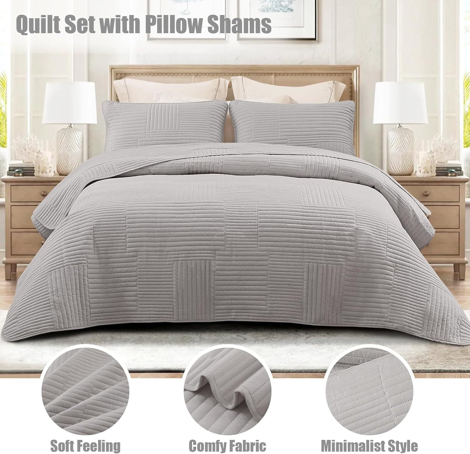 Whale Flotilla Queen Quilt Set, Soft Lightweight Quilts Bedspreads Coverlet with Striped Pattern, Bedding Sets with 2 Pillow Shams, Reversible Bed Cover for All Seasons, 96x90 Inches, Light Grey