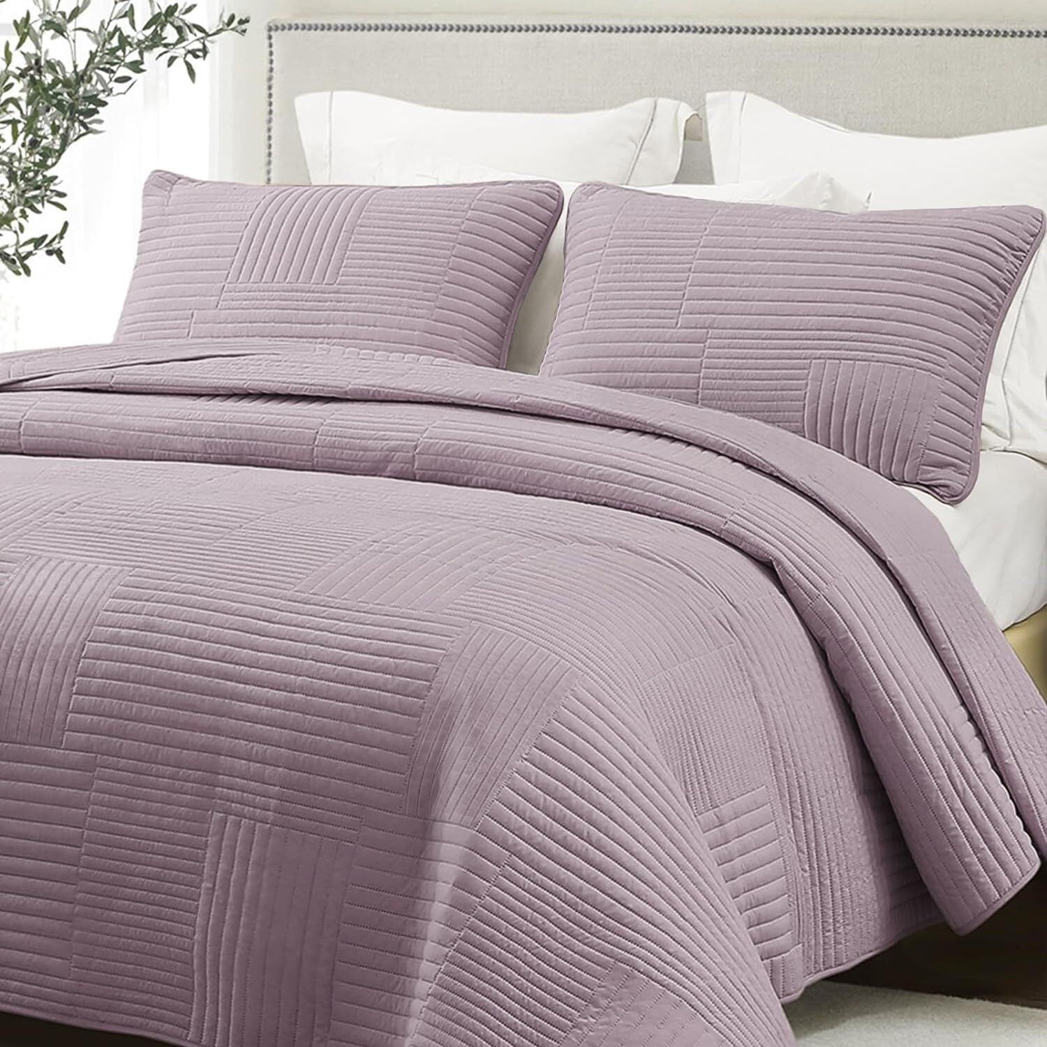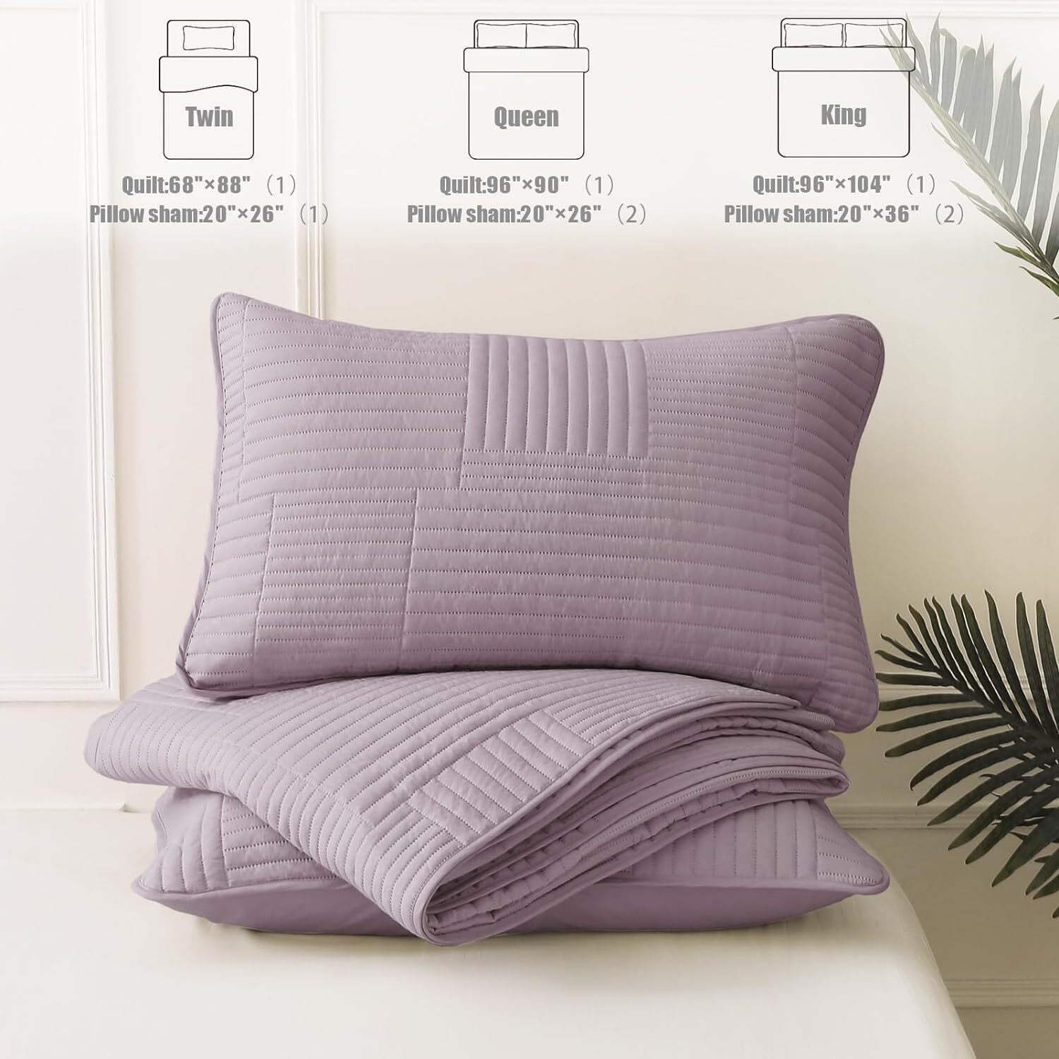 Whale Flotilla Queen Quilt Set, Soft Lightweight Quilts Bedspreads Coverlet with Striped Pattern, Bedding Sets with 2 Pillow Shams, Reversible Bed Cover for All Seasons, 96x90 Inches, Lilac Ash