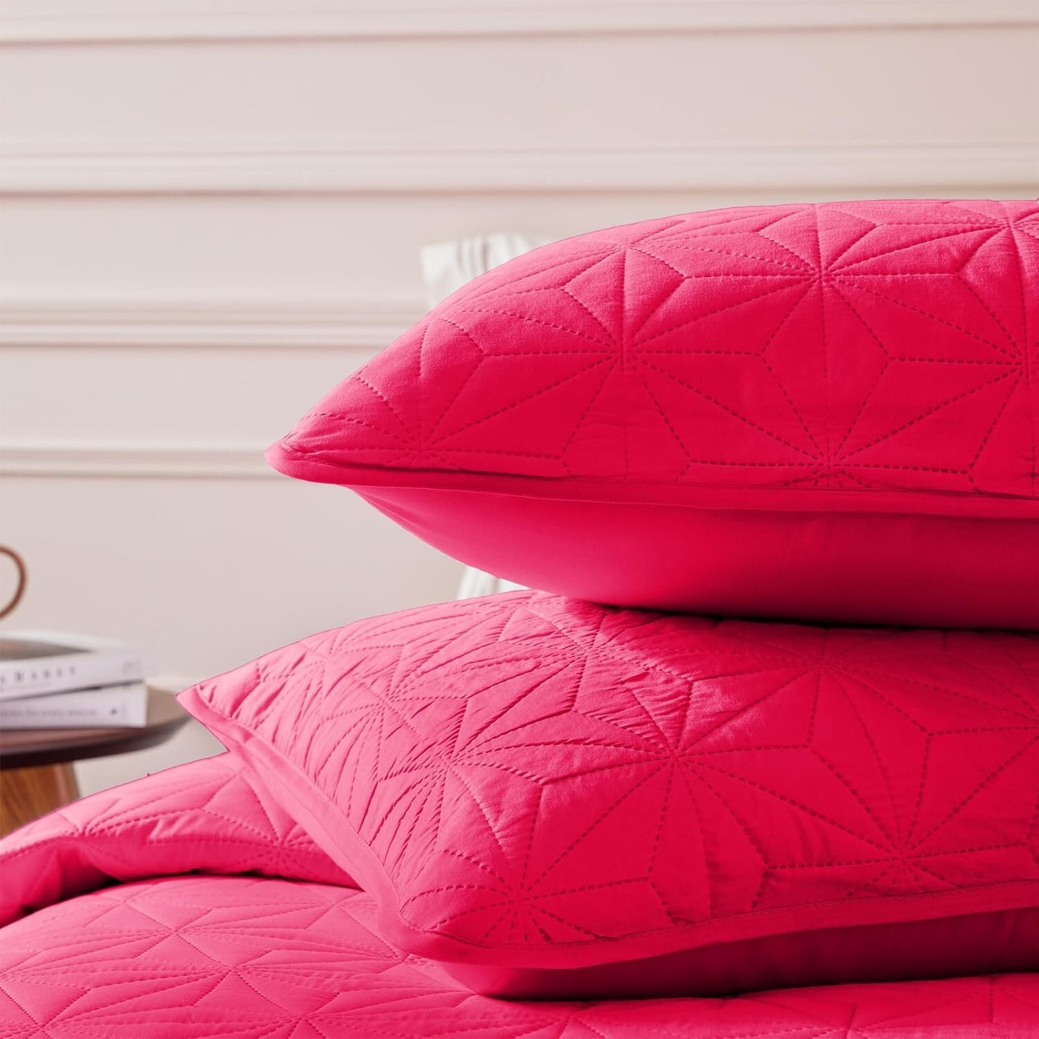 What You Can Get: The quilt set includes one King quilt (104?\x96") and two pillowcases (20?\x36?\ ).PREMIUM MATERIAL: Our quilt sets are made with advanced ultrasonic technology, featuring Anti-wrinkle, durability and tightness in fabric and stitching. The quilt sets are filled with high quality microfiber, making it softer, more breathable and lightweight. Feeling super comfortable and warm, you can easily fall into a sound sleep.MINIMALISTIC STYLE: Classic minimalist geometric patterns can easily match your home decor. We offer plenty of vibrant colors for you. Just choose the color according to the style of your bedroom, living room and sofa. It would be the best gift for your friends and family.MULTI-PURPOSE: It is suitable for all seasons. Used as a breathable quilt in summer and a perfect layering blanket in winter. Depending on the season, you can use it as a quilt, blanket, coverlet, bedspread or just simply an elegant bedding decoration.Easy Care: Machine washable in cold water, gentle cycle, tumble dry on low heat and do not bleach. No shrinkage, No pilling, No colour fading and No unraveling after washing. Our quilt sets will remain soft after multiple washes.