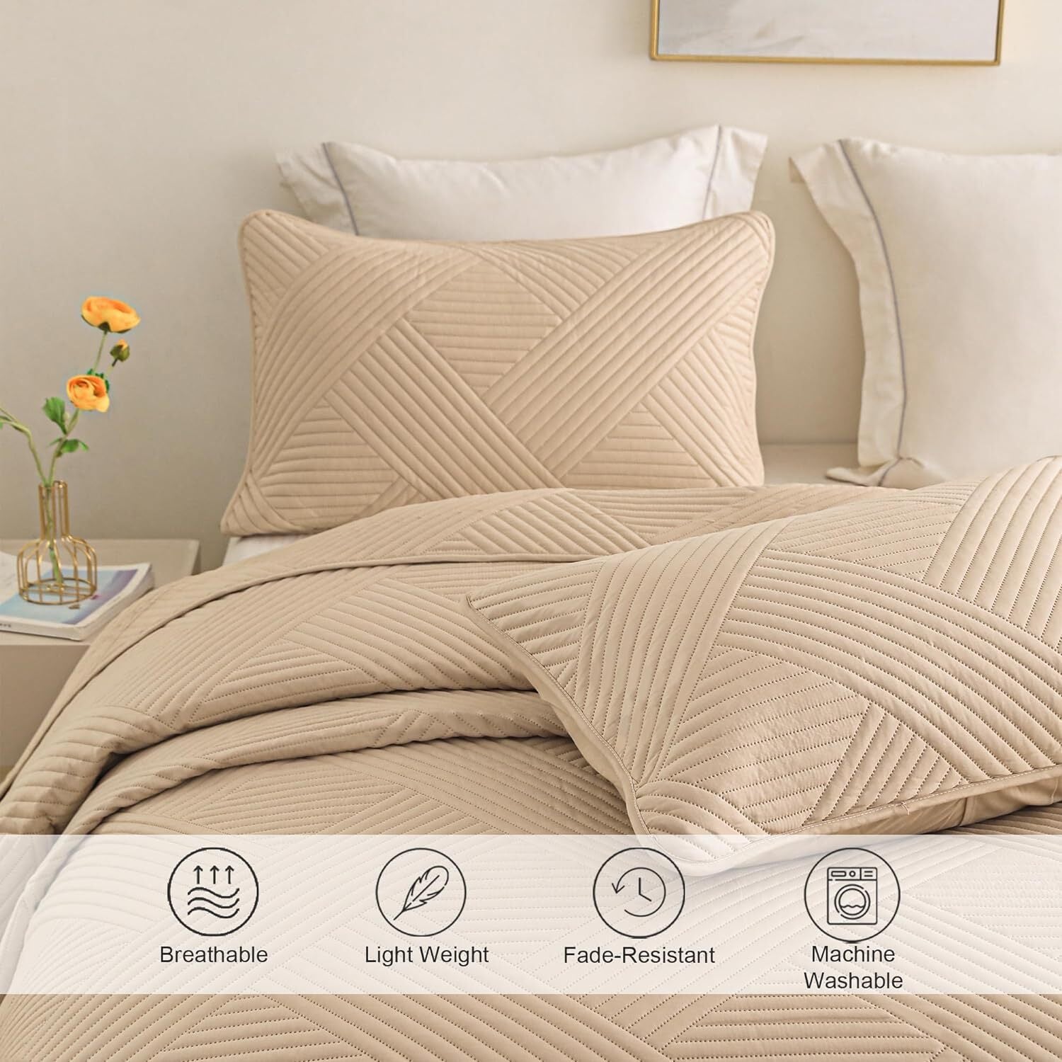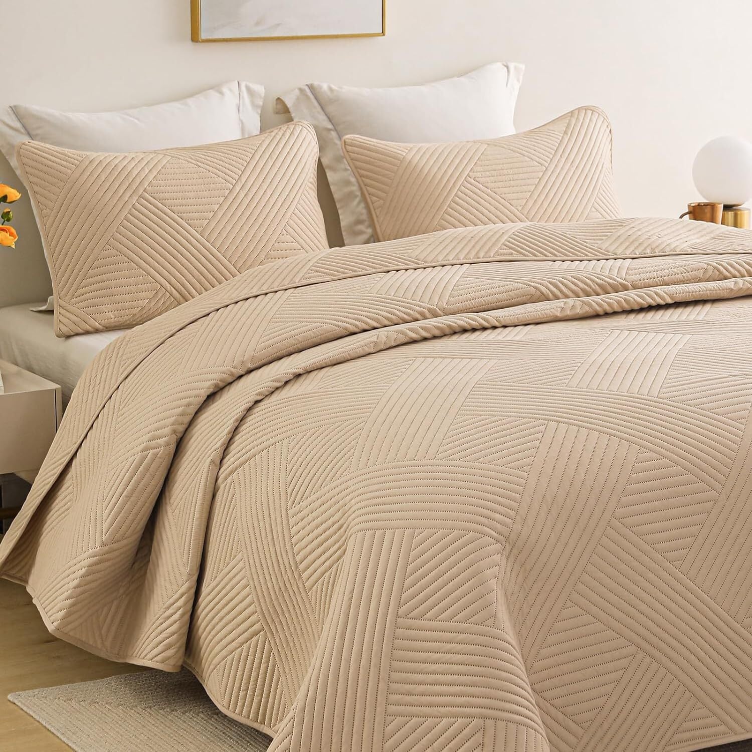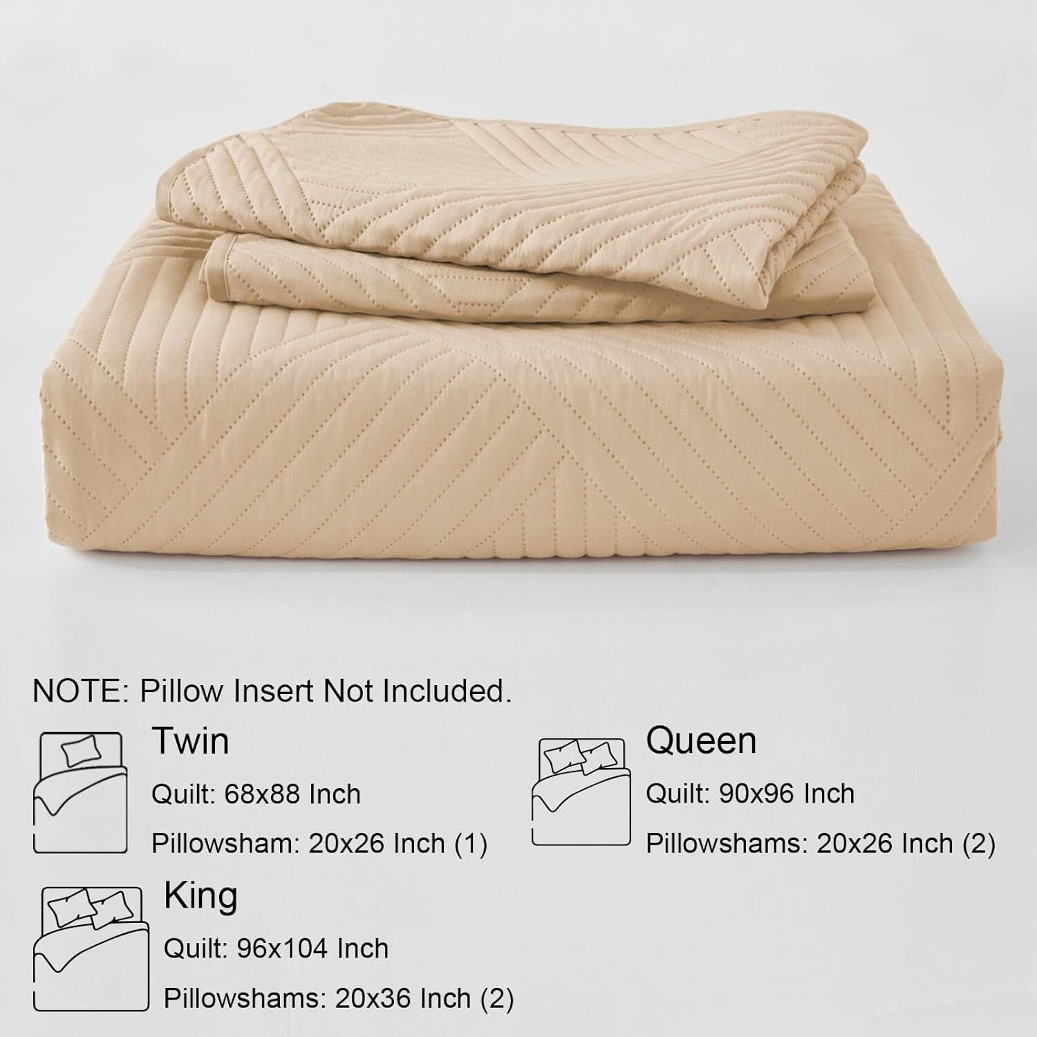 What You Can Get: The quilt set includes one King quilt (104?\x96") and two pillowcases (20?\x36?\ ).PREMIUM MATERIAL: Our quilt sets are made with advanced ultrasonic technology, featuring Anti-wrinkle, durability and tightness in fabric and stitching. The quilt sets are filled with high quality microfiber, making it softer, more breathable and lightweight. Feeling super comfortable and warm, you can easily fall into a sound sleep.MINIMALISTIC STYLE: Classic minimalist geometric patterns can easily match your home decor. We offer plenty of vibrant colors for you. Just choose the color according to the style of your bedroom, living room and sofa. It would be the best gift for your friends and family.MULTI-PURPOSE: It is suitable for all seasons. Used as a breathable quilt in summer and a perfect layering blanket in winter. Depending on the season, you can use it as a quilt, blanket, coverlet, bedspread or just simply an elegant bedding decoration.Easy Care: Machine washable in cold water, gentle cycle, tumble dry on low heat and do not bleach. No shrinkage, No pilling, No colour fading and No unraveling after washing. Our quilt sets will remain soft after multiple washes.