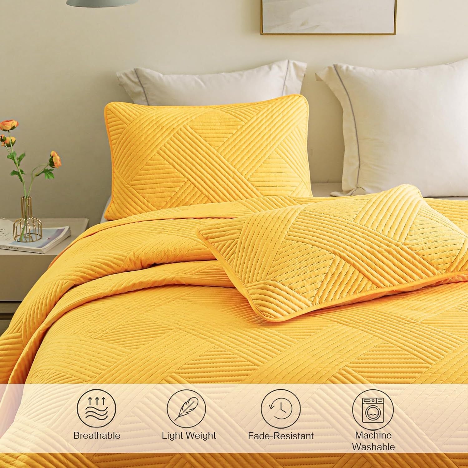 What You Can Get: The quilt set includes one Twin quilt (88?\x68?\) and one pillowcase (20?\x26?\ ).PREMIUM MATERIAL: Our quilt sets are made with advanced ultrasonic technology, featuring Anti-wrinkle, durability and tightness in fabric and stitching. The quilt sets are filled with high quality microfiber, making it softer, more breathable and lightweight. Feeling super comfortable and warm, you can easily fall into a sound sleep.MINIMALISTIC STYLE: Classic minimalist geometric patterns can easily match your home decor. We offer plenty of vibrant colors for you. Just choose the color according to the style of your bedroom, living room and sofa. It would be the best gift for your friends and family.MULTI-PURPOSE: It is suitable for all seasons. Used as a breathable quilt in summer and a perfect layering blanket in winter. Depending on the season, you can use it as a quilt, blanket, coverlet, bedspread or just simply an elegant bedding decoration.Easy Care: Machine washable in cold water, gentle cycle, tumble dry on low heat and do not bleach. No shrinkage, No pilling, No colour fading and No unraveling after washing. Our quilt sets will remain soft after multiple washes.