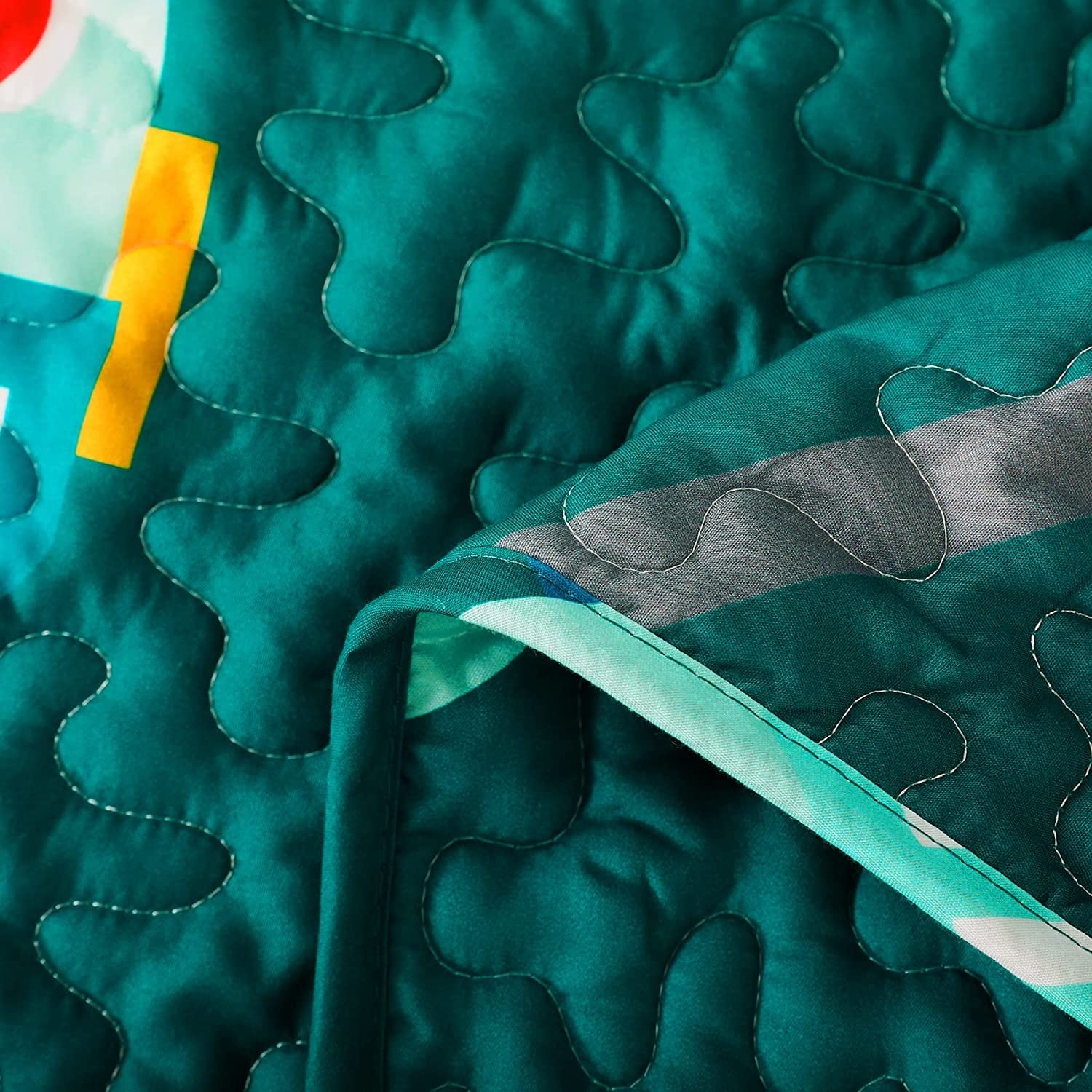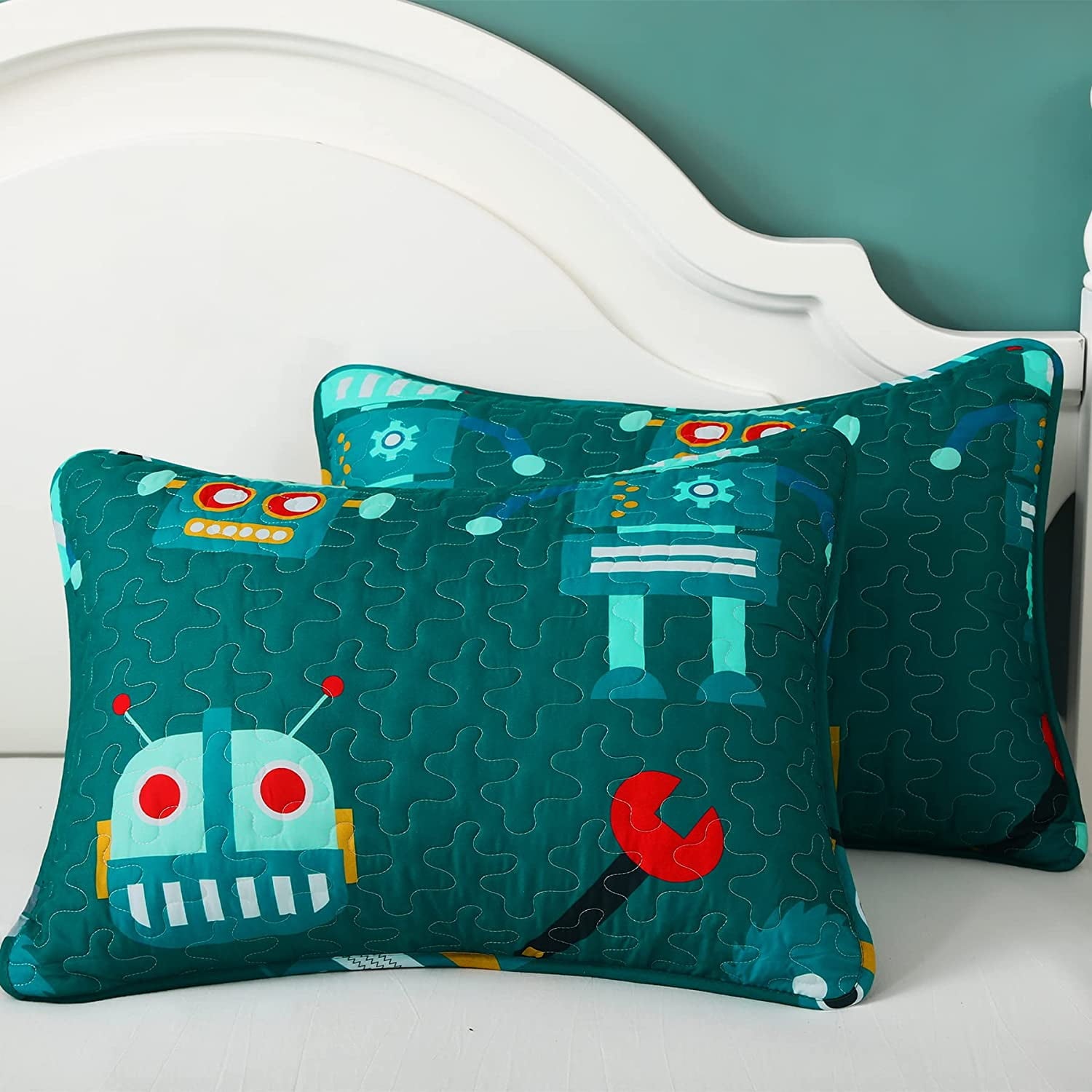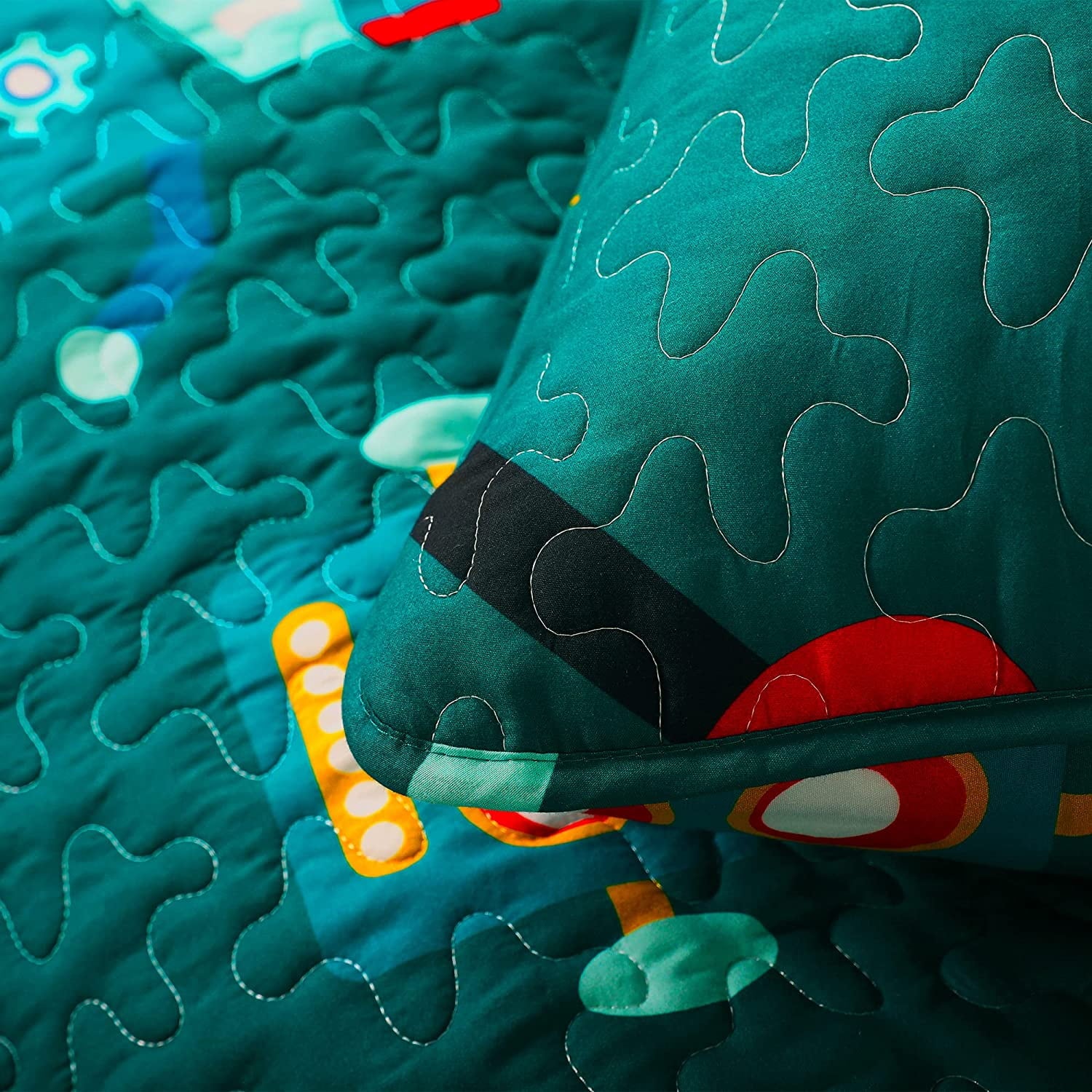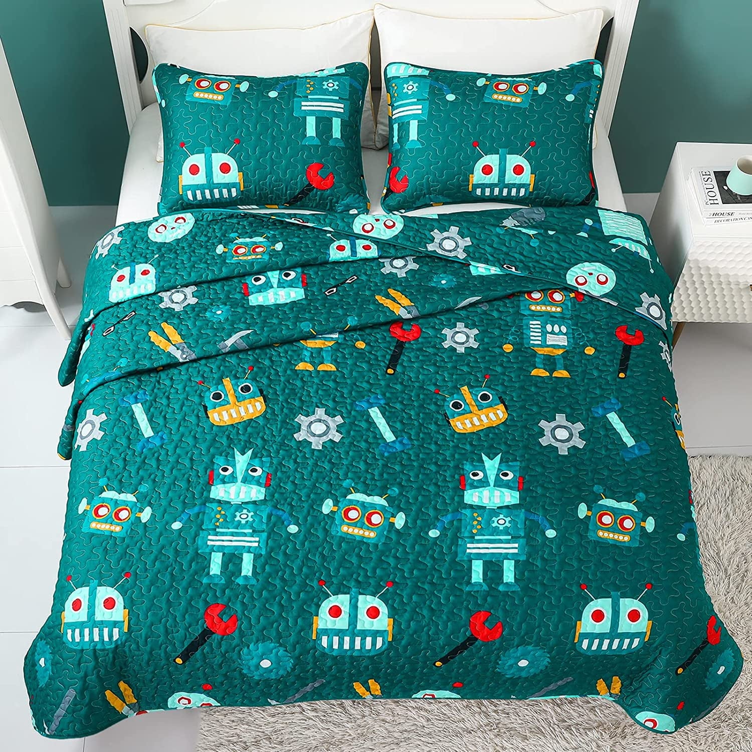 Package Include: 1 twin size quilt (68x88 inch) and 1 pillow sham (20x26 inch).Cute Design: Our kids quilt, printed with cartoon machine parts and funny robot images, put children in a fairy tale world, inviting them to imagine and create a new paradise in sweet dreams. Colorful cartoon bedspread could also add more playful elements to your room. What a good choice for you and your children.Super Soft and Durable: With excellent stitching technology, the fabric is durable and wear resistent, suitable for machine wash or hand wash. The vibrant and bright color of the pattern can hardly fade after washing. Our lightweight quilt is also ultra soft and breathable, offering you a comfortable rest without breaking out or having nightmares.