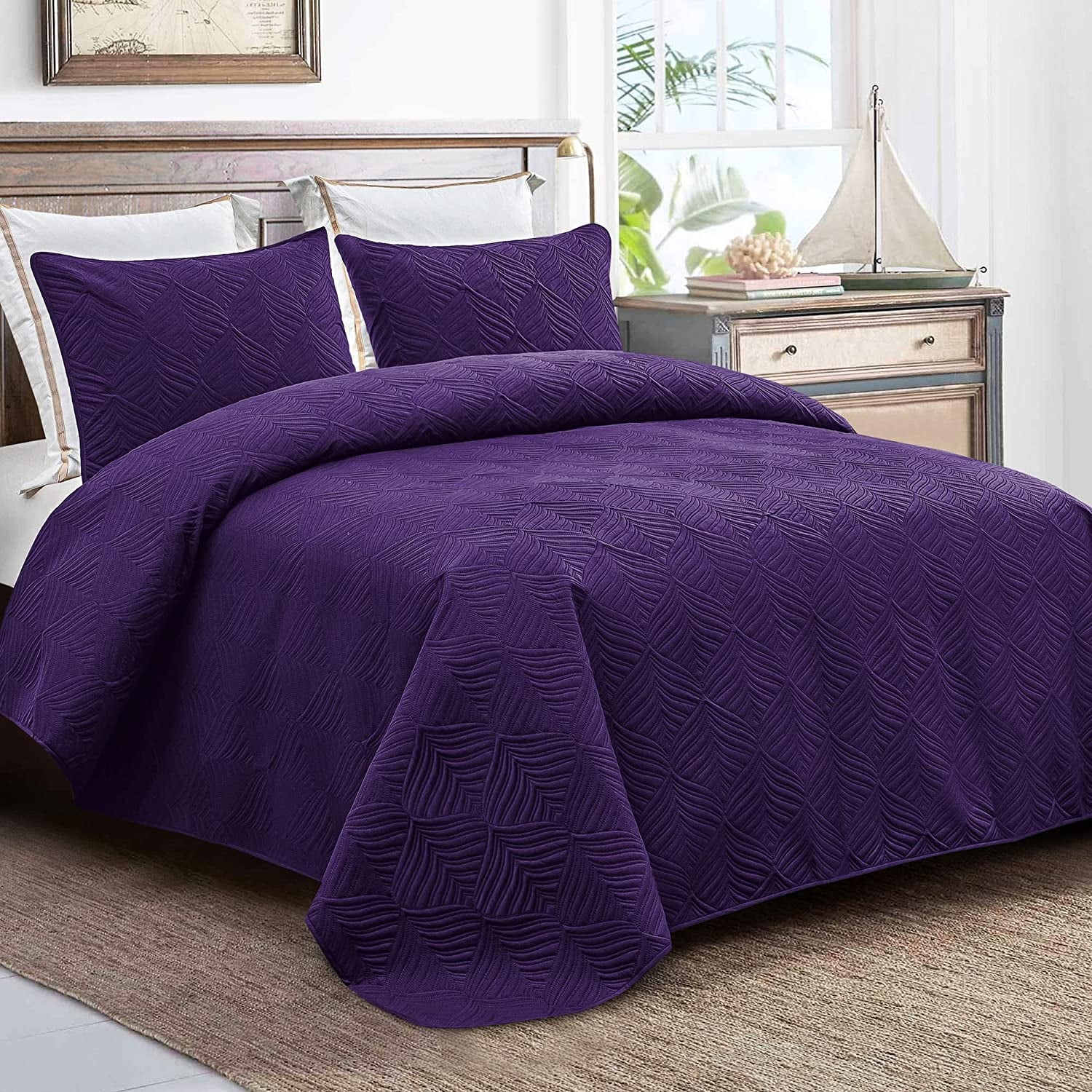 Whale Flotilla 3-Piece California King Size Quilt Set, Soft Ultrasonic Embossed Bedding Set, Lightweight Bedspread Coverlet with Vintage Pattern, Reversible Bed Cover for All Seasons, Vintage Purple