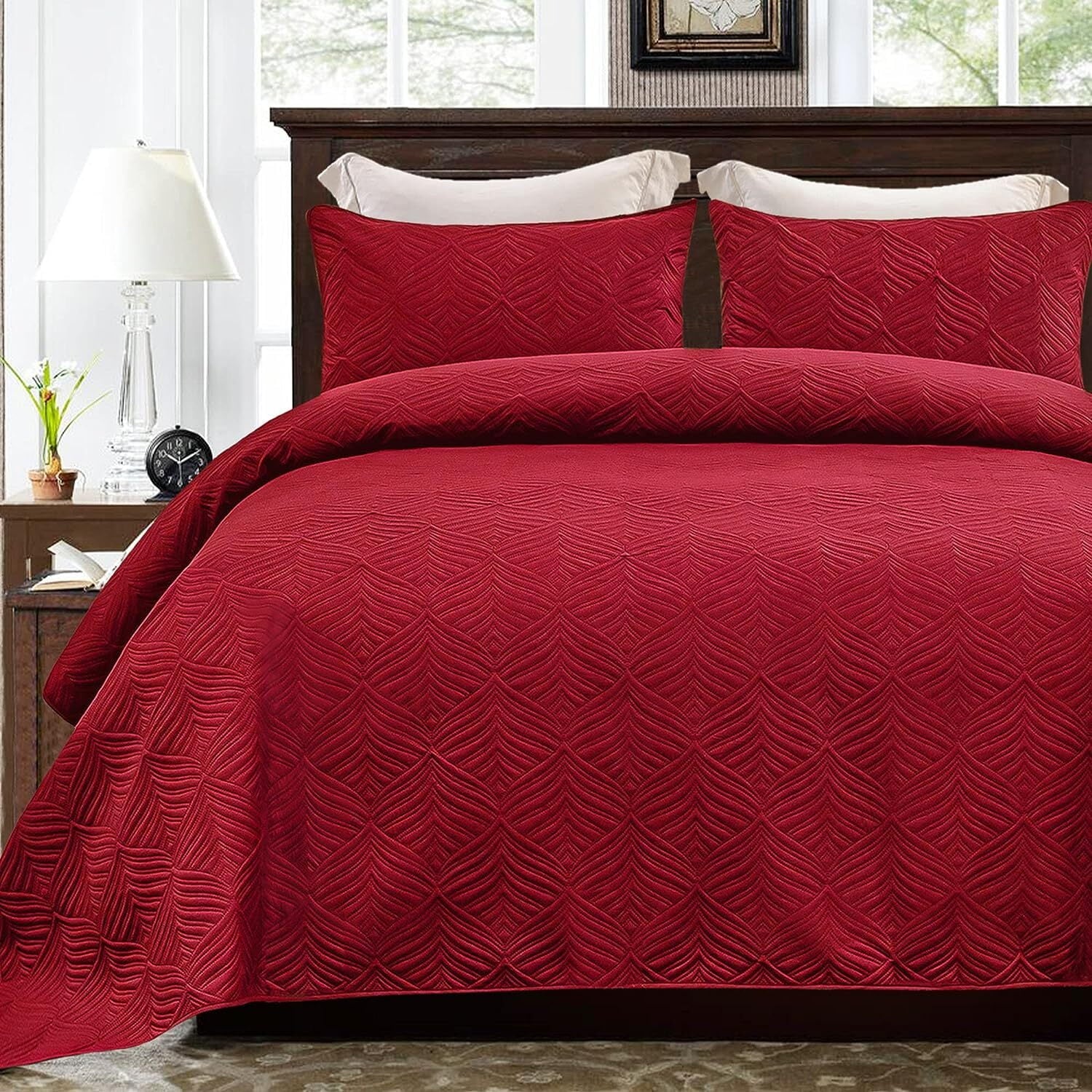 The soft and lightweight quilt set is made of breathable microfiber polyester, suitable for all seasons. The microfiber coverlet is durable, washable and dry-friendly. It holds up well in the wash, no fading, no pilling, no shedding, no deformation. It is a ultrasonic quilt bedding set that can be used as bed cover, coverlet and bedspread in bedroom, living room, guestroom.Vintage Embossed Pattern: Quilted with European style baroque patterns, this beautiful embossed bedspread stands out from plain ones, giving your bedroom and living room an unique and elegant vibe.Sizes and Colors: Four sizes are available 68?\x 88?\quilt is ideal for twin bed, 96?\x 90?\for queen bed, 96?\x104?\for king bed, and 104?\x112?\is ideal for California king bed. It also comes in an array of colors, from neutrals to bright shades, to complement any style of home.Soft Lightweight Coverlet: This ultra comfortable quilt bedding set is soft to the touch and light as a feather. Thanks to its breathable brushed polyester padding and cover, the lightweight coverlet is well suited for year-round use, especially kind to hot sleeper.Versatile Bedspread: Combined with practicality and beauty, our lightweight quilt set is your wonderful pick for indoor and outdoor use. It is a stylish ornament for your home decoration, a decent gift for birthday, housewarming, Thanksgiving and Christmas party, or a cozy car accessory for long trip.Care Instruction: The durable ultrasonic quilt set is machine washed and dried. Machine wash in cold water on gentle cycle, tumble dry low. No blench or iron. Please wash it separately and pat it gently before the first use so as to have a more fluffy and softer bed cover.