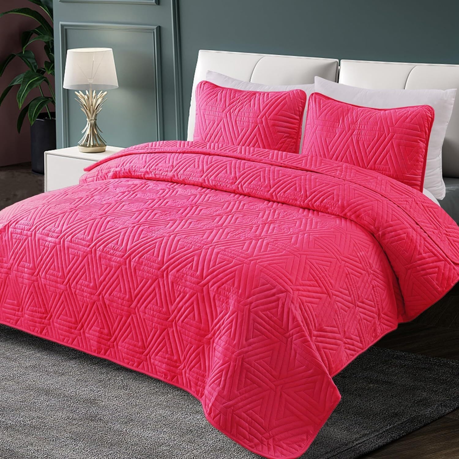 Whale Flotilla Soft King Size Quilt Set for All Seasons, 3-Piece Ultrasonic Geometric Bedding Set, Lightweight Reversible Bedspread, Coverlet, Bed Cover with 2 Pillow Shams, Hot Pink