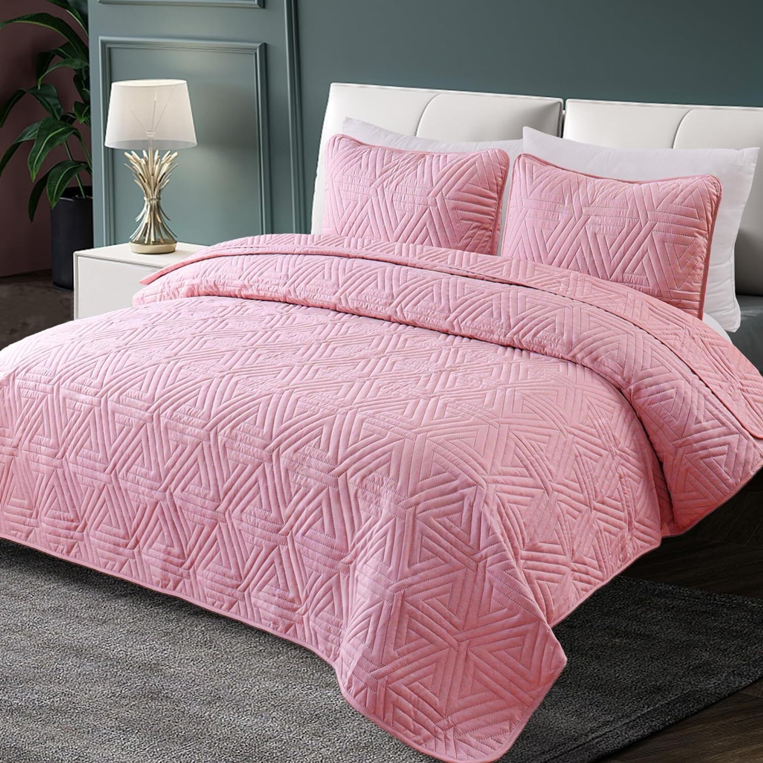 Whale Flotilla 3-Piece King Size Quilt Set/Bedspreads/Coverlets for All Season, Classic Geometric Pattern Bedding Set with 2 Pillow Shams, Soft and Lightweight, Pink