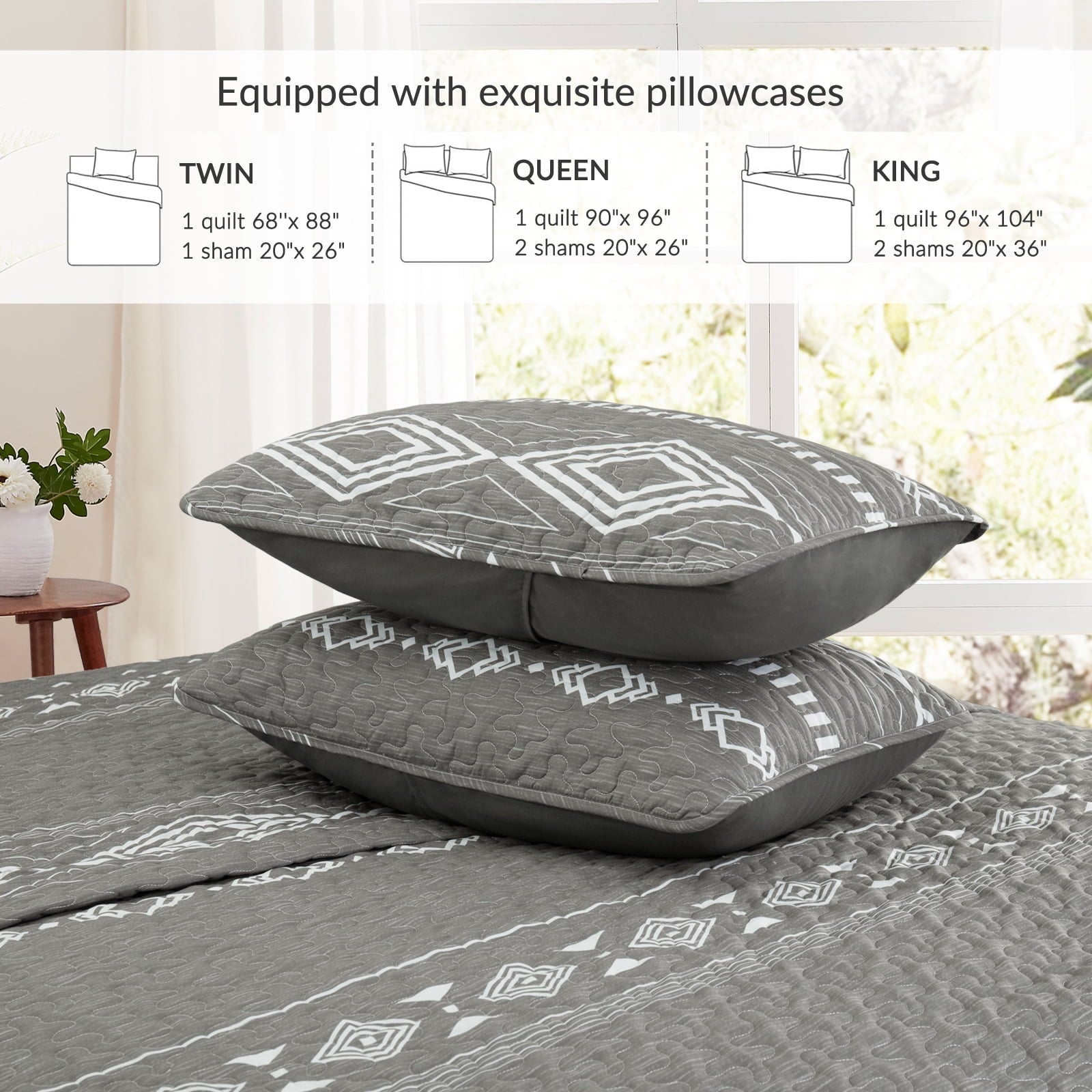 Whale Flotilla Reversible Ultra Soft Printed Quilts Queen Size, Lightweight Patchwork Geometric Stripes Bedspreads Coverlets Queen Quilt Bedding Set with 2 Pillow Shams for All Seasons, Deep Grey