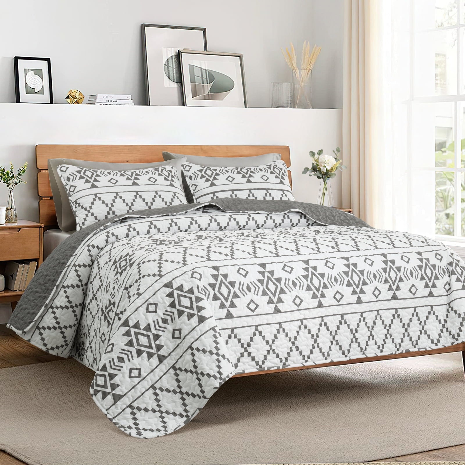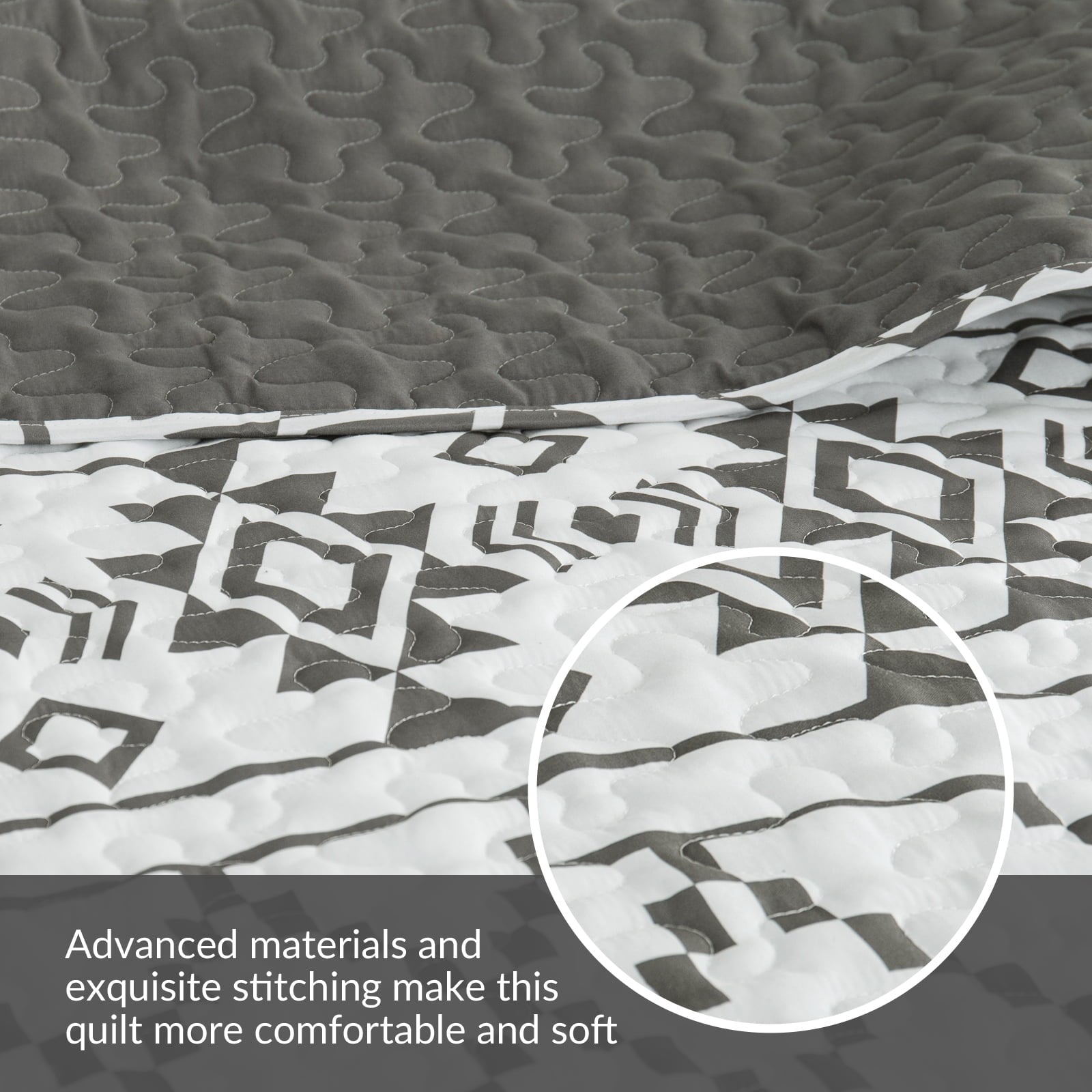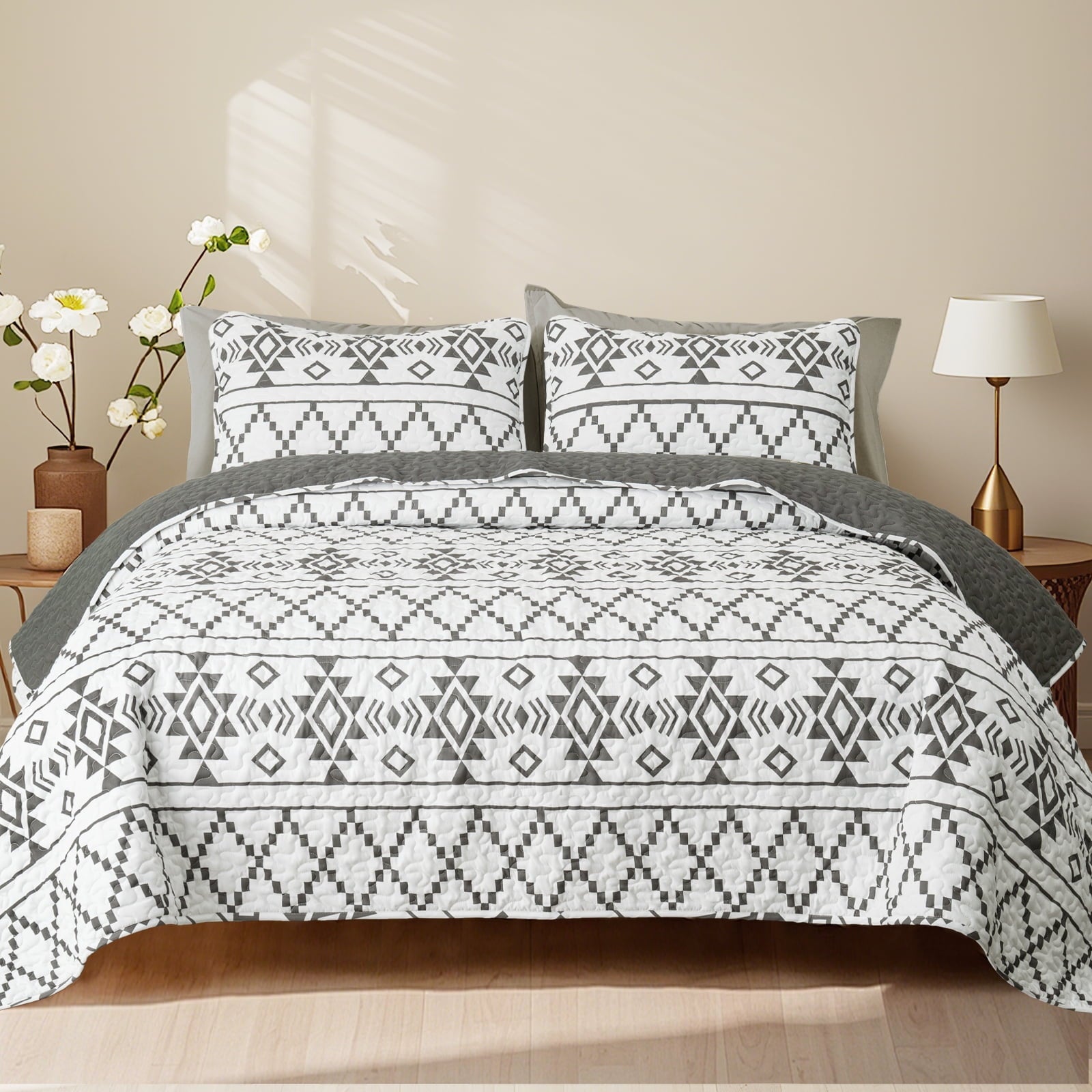 Whale Flotilla Reversible Ultra Soft Printed Quilts Twin Size, Lightweight Patchwork Geometric Stripes Bedspreads Coverlets Twin Quilt Bedding Set with 1 Pillow Sham for All Seasons, White/Grey